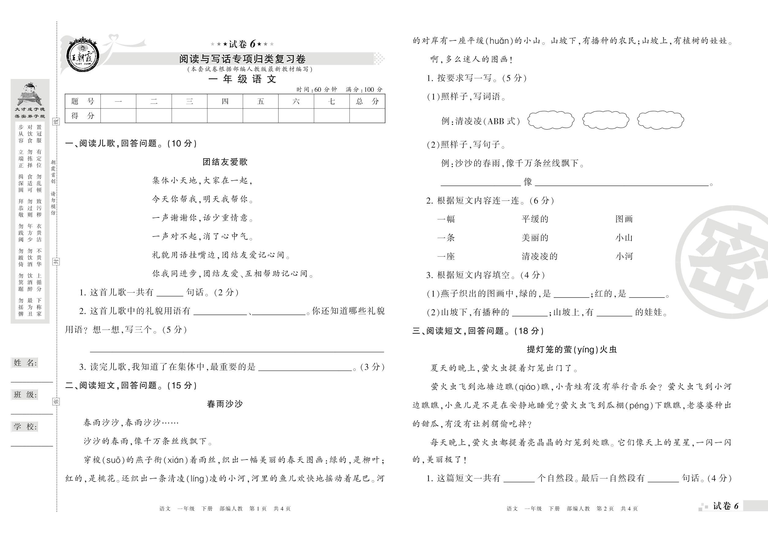 王朝霞期末专项卷——阅读与写话专项归类复习卷一年级下册语文(人教版)_R210731191118【6】