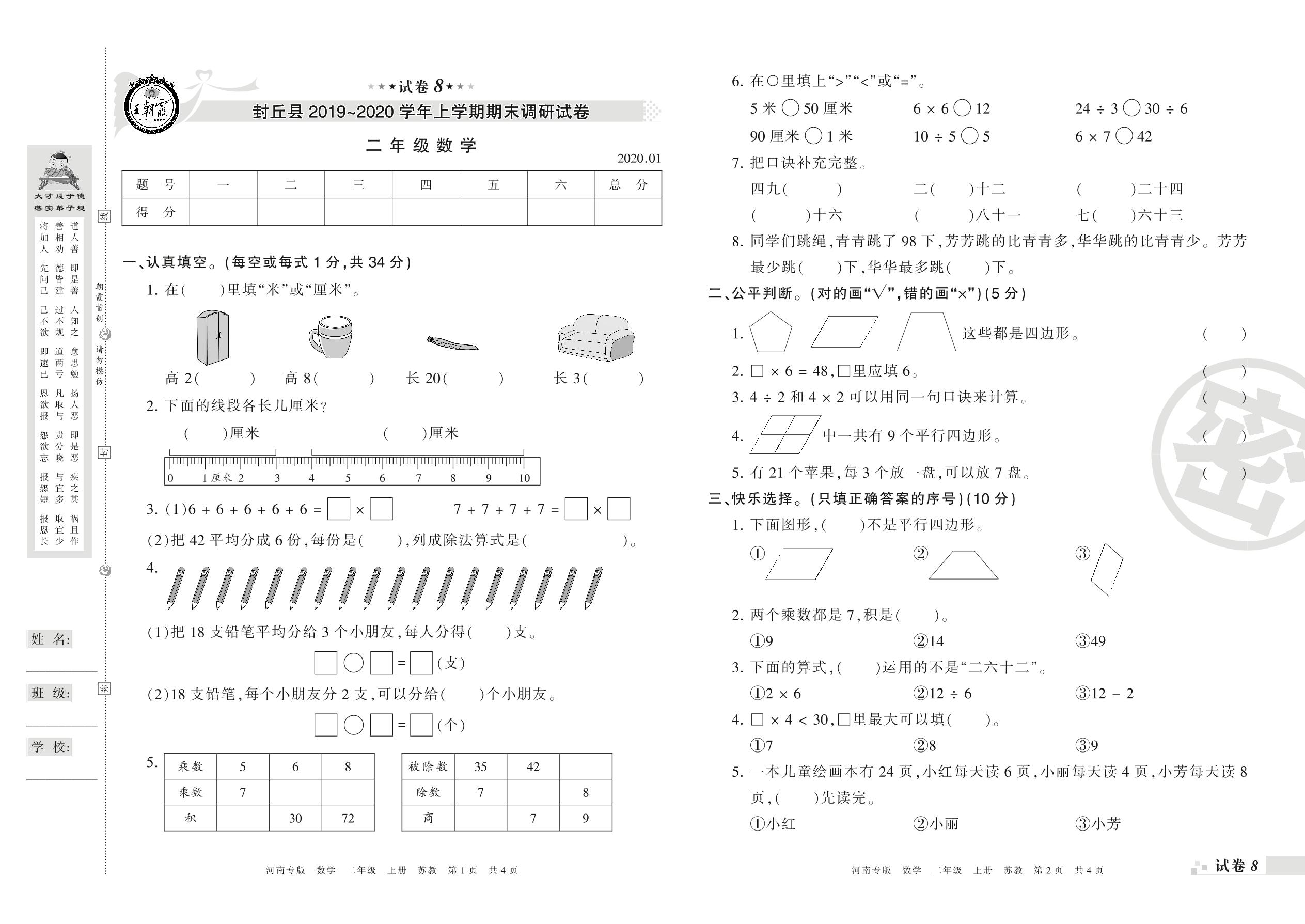 2019-2020学年第一学期新乡市封丘县二年级数学试卷(苏教版)【8】