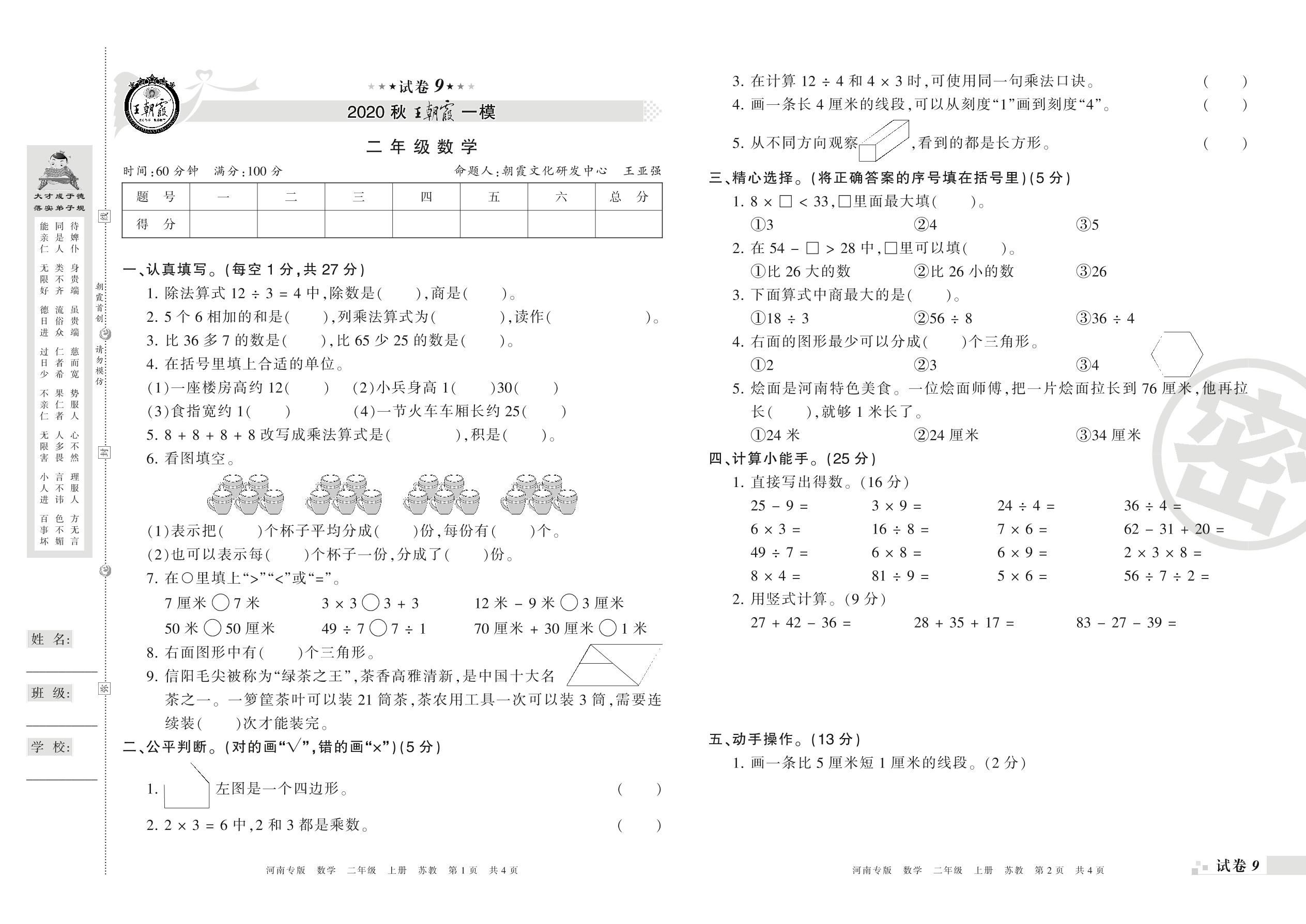 王朝霞期末模拟卷二年级上册数学(苏教版)_R21080384440【9】