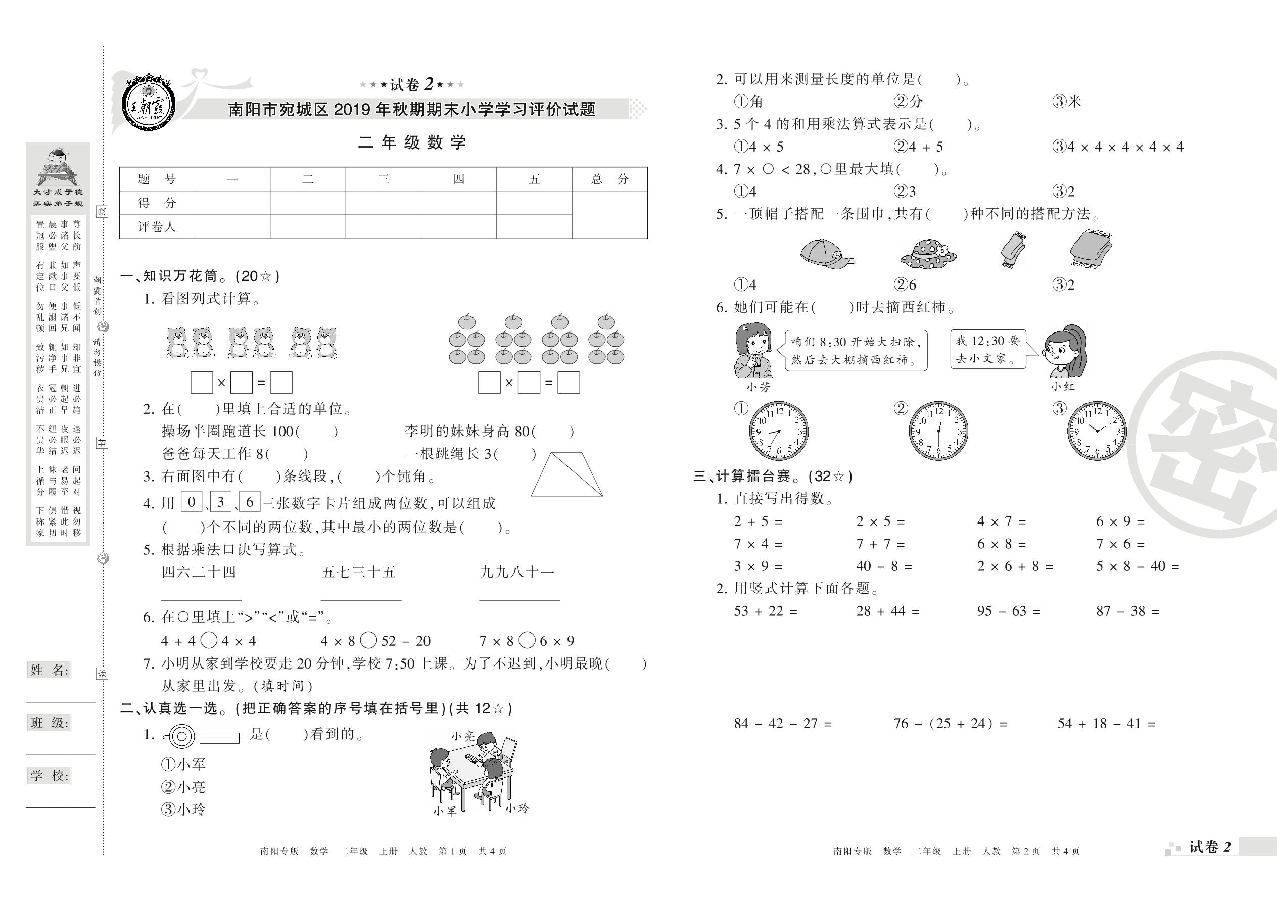 2019-2020学年第一学期南阳市宛城区二年级数学试卷(人教版)【2】