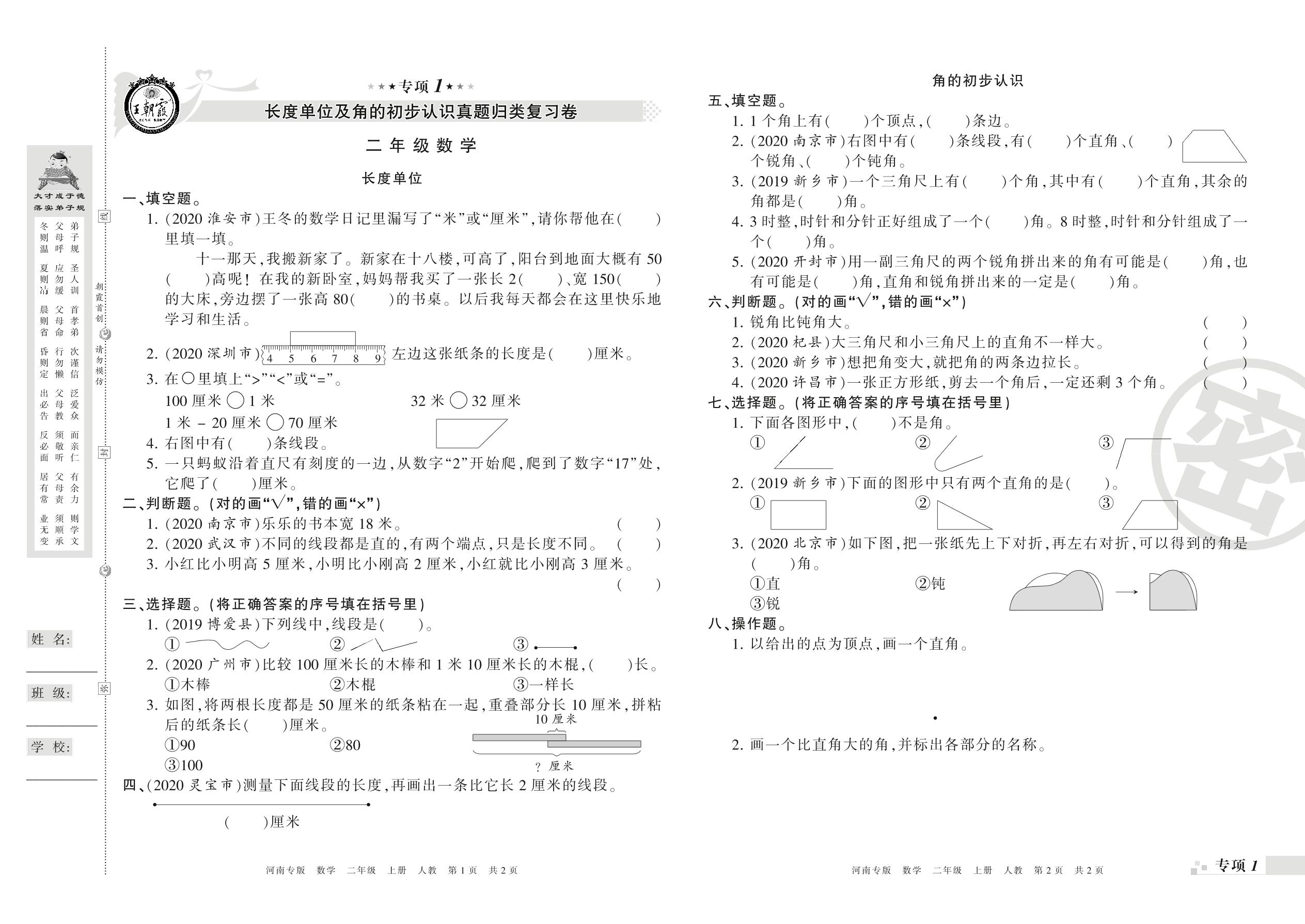 王朝霞期末专项卷——长度单位及角的初步认识、100以内的加法和减法真题归类复习二年级上册数学(人教版)_R21080384559【0】