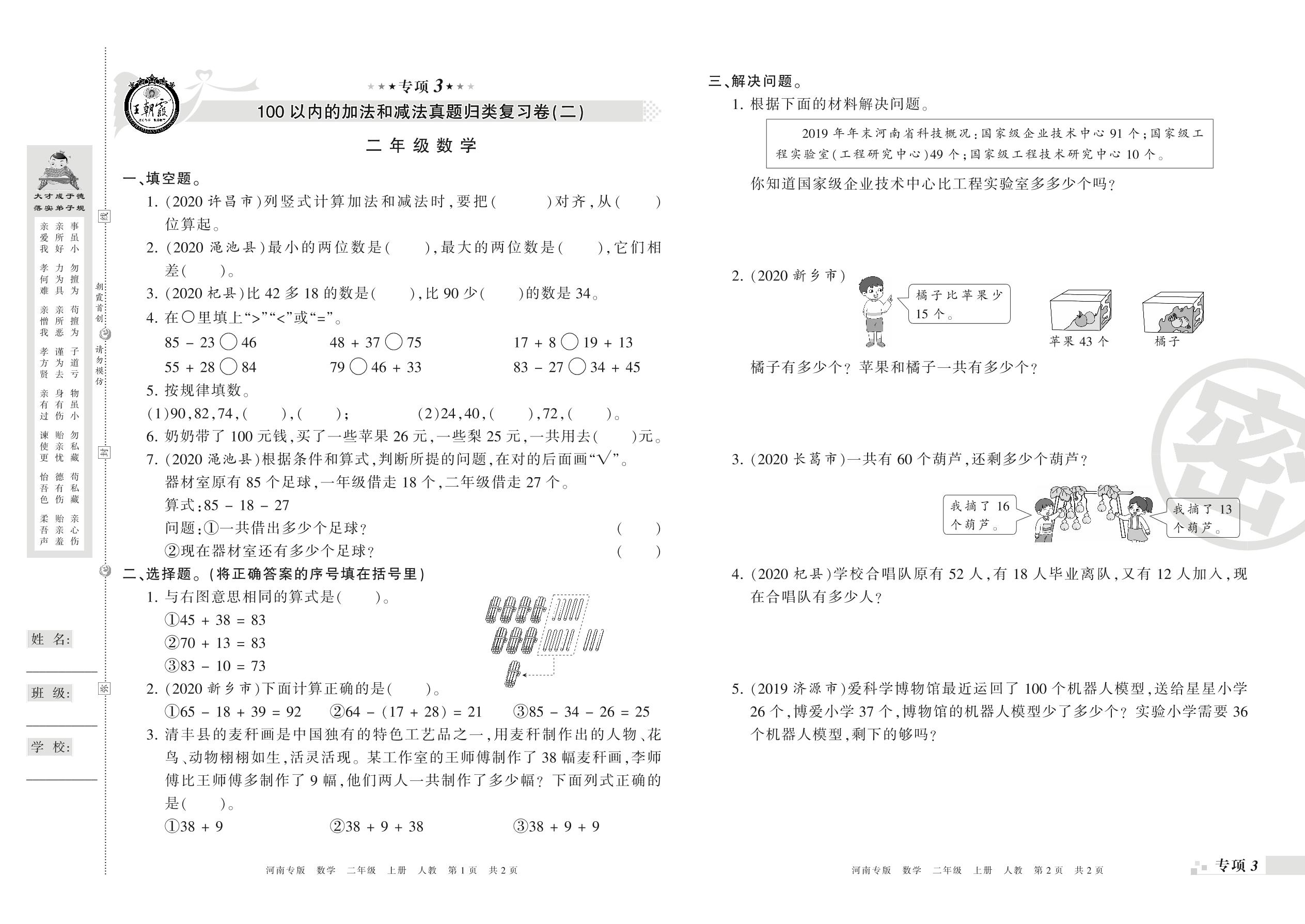 王朝霞期末专项卷——100以内的加法和减法、表内乘法真题归类复习二年级上册数学(人教版)_R21080384601【0】