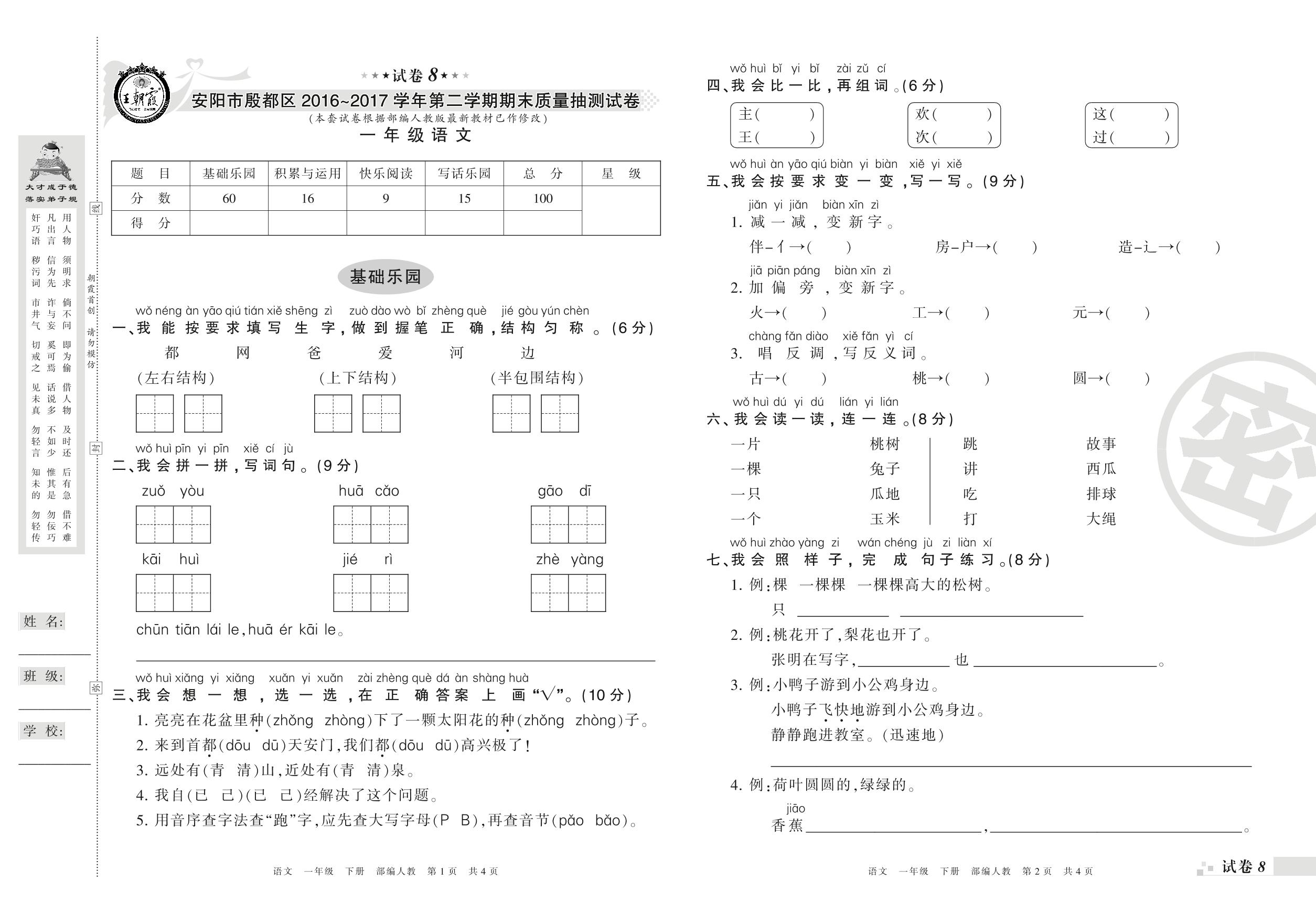 2016-2017学年第二学期安阳市殷都区一年级语文试卷(人教版)【8】