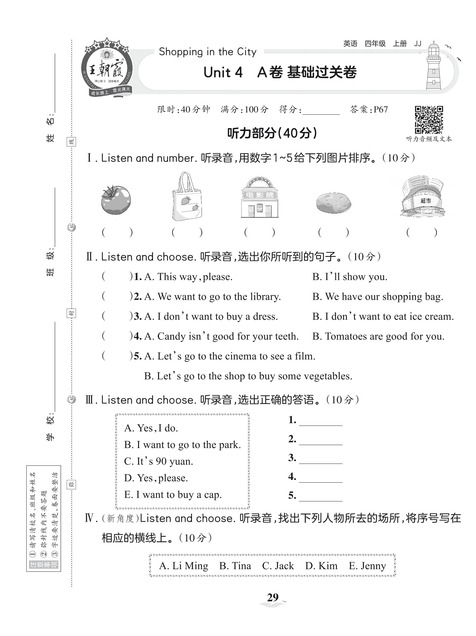 2023上册四年级英语冀教版 Unit 4 A卷 基础过关卷