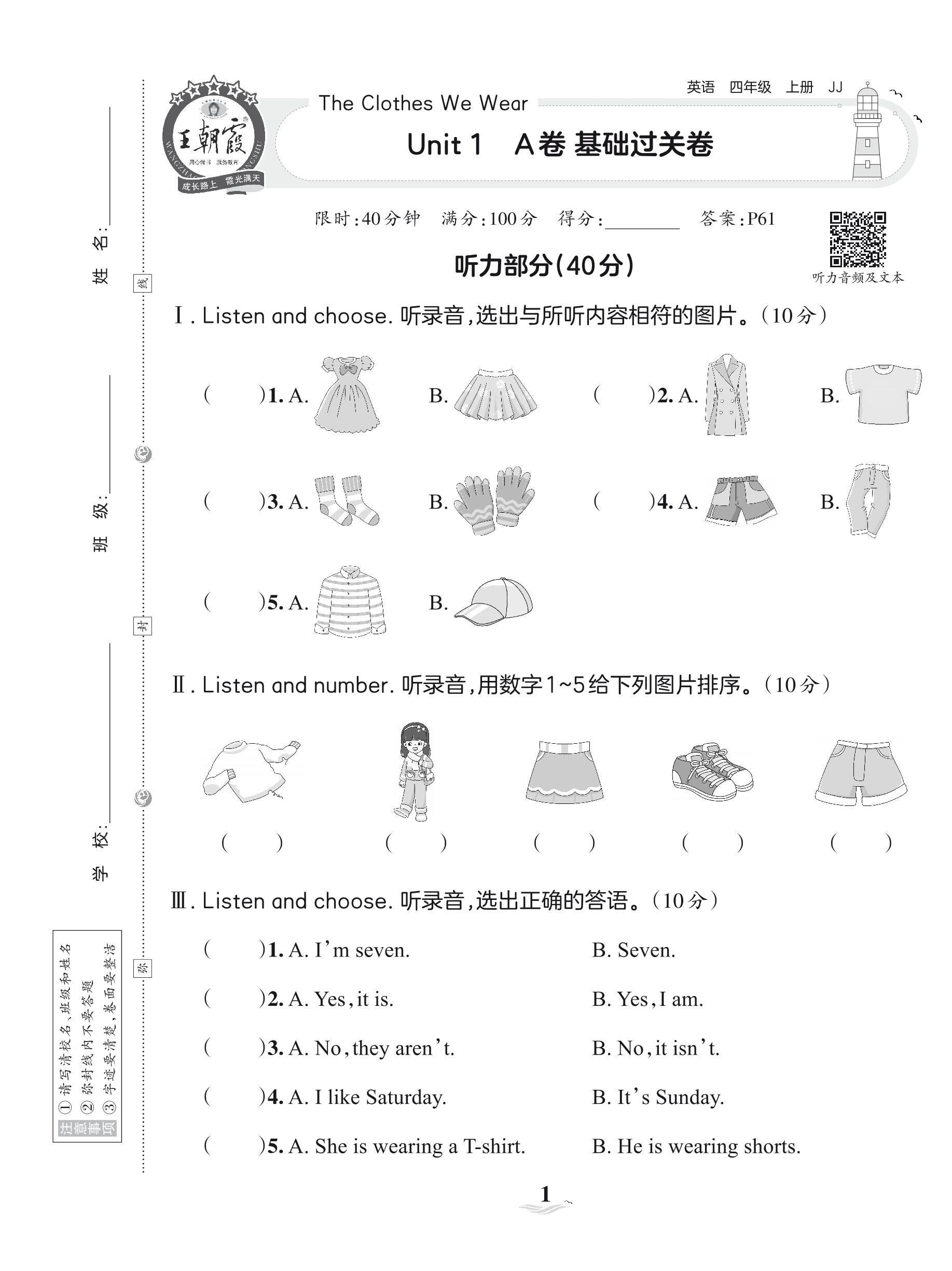 2023上册四年级英语冀教版 Unit 1 A卷 基础过关卷