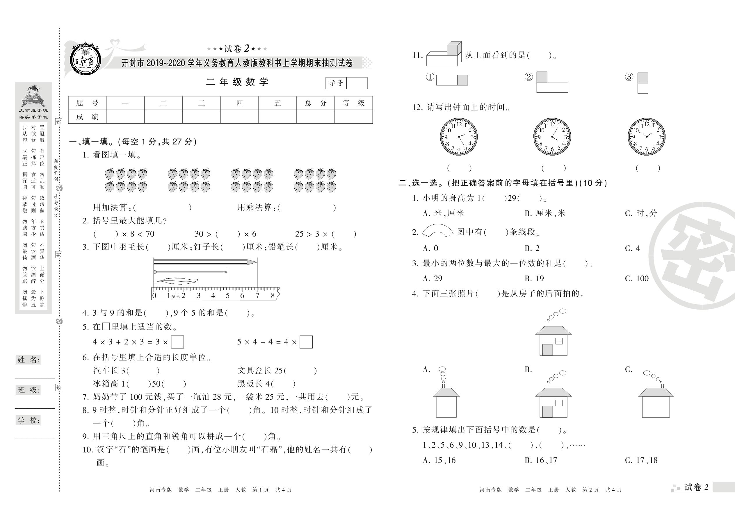 2019-2020学年第一学期开封市二年级数学试卷(人教版)【2】