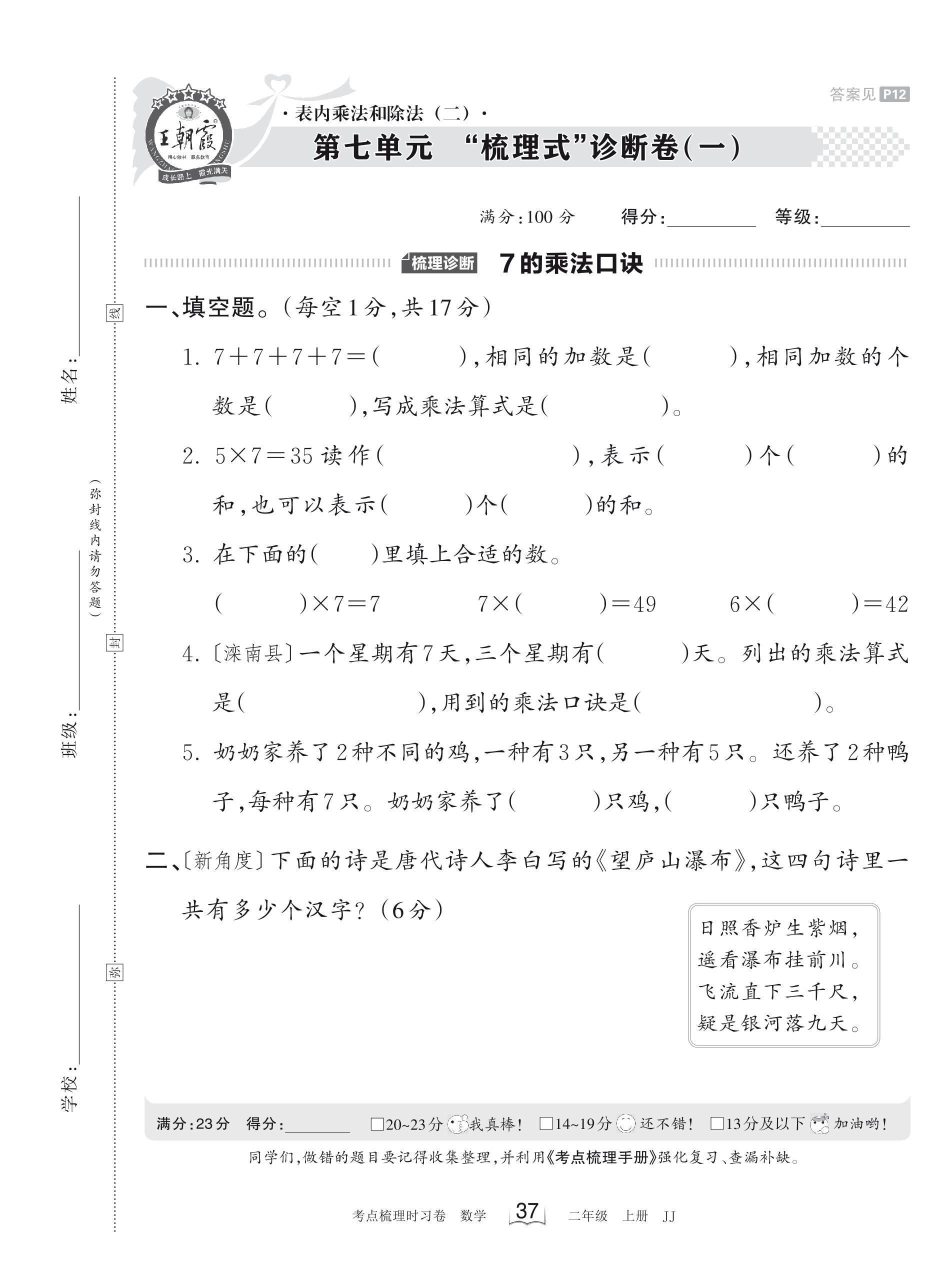 2023上册二年级数学冀教版 第七单元 “梳理式”诊断卷(一)