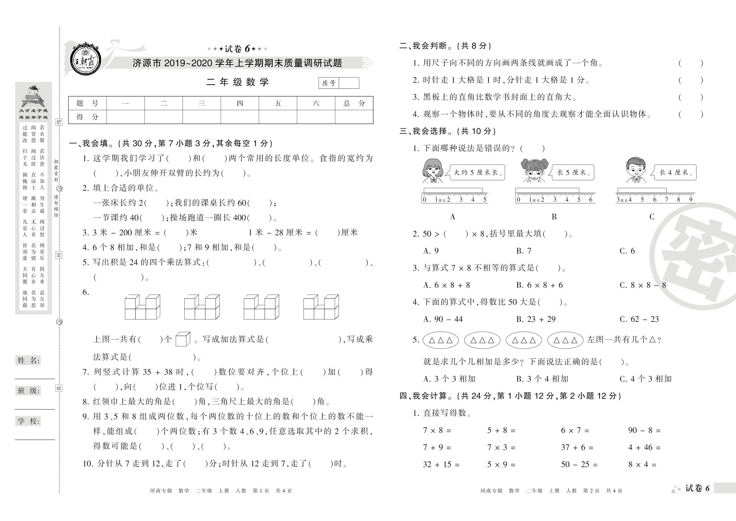 2019-2020学年第一学期济源市二年级数学试卷(人教版)【6】