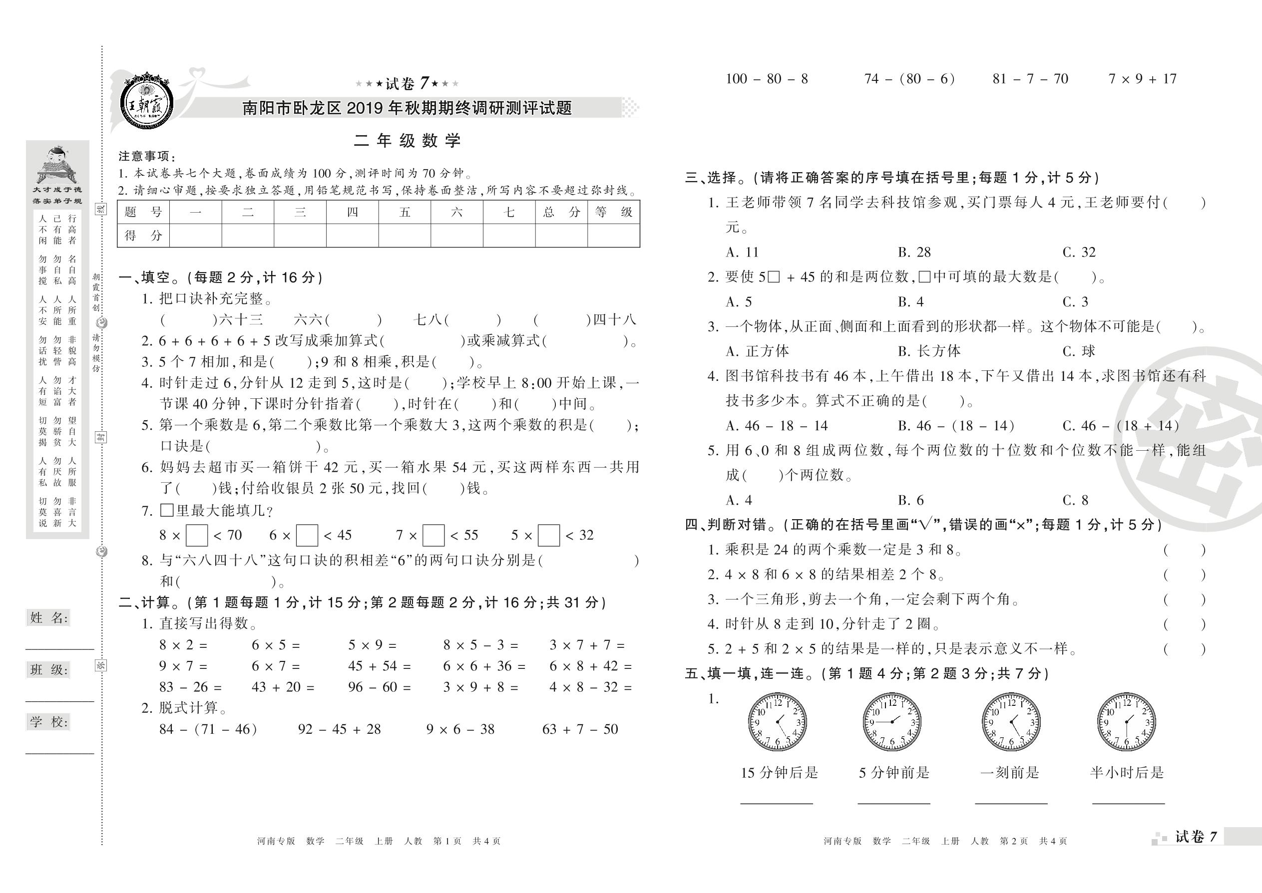 2019-2020学年第一学期南阳市卧龙区二年级数学试卷(人教版)【7】