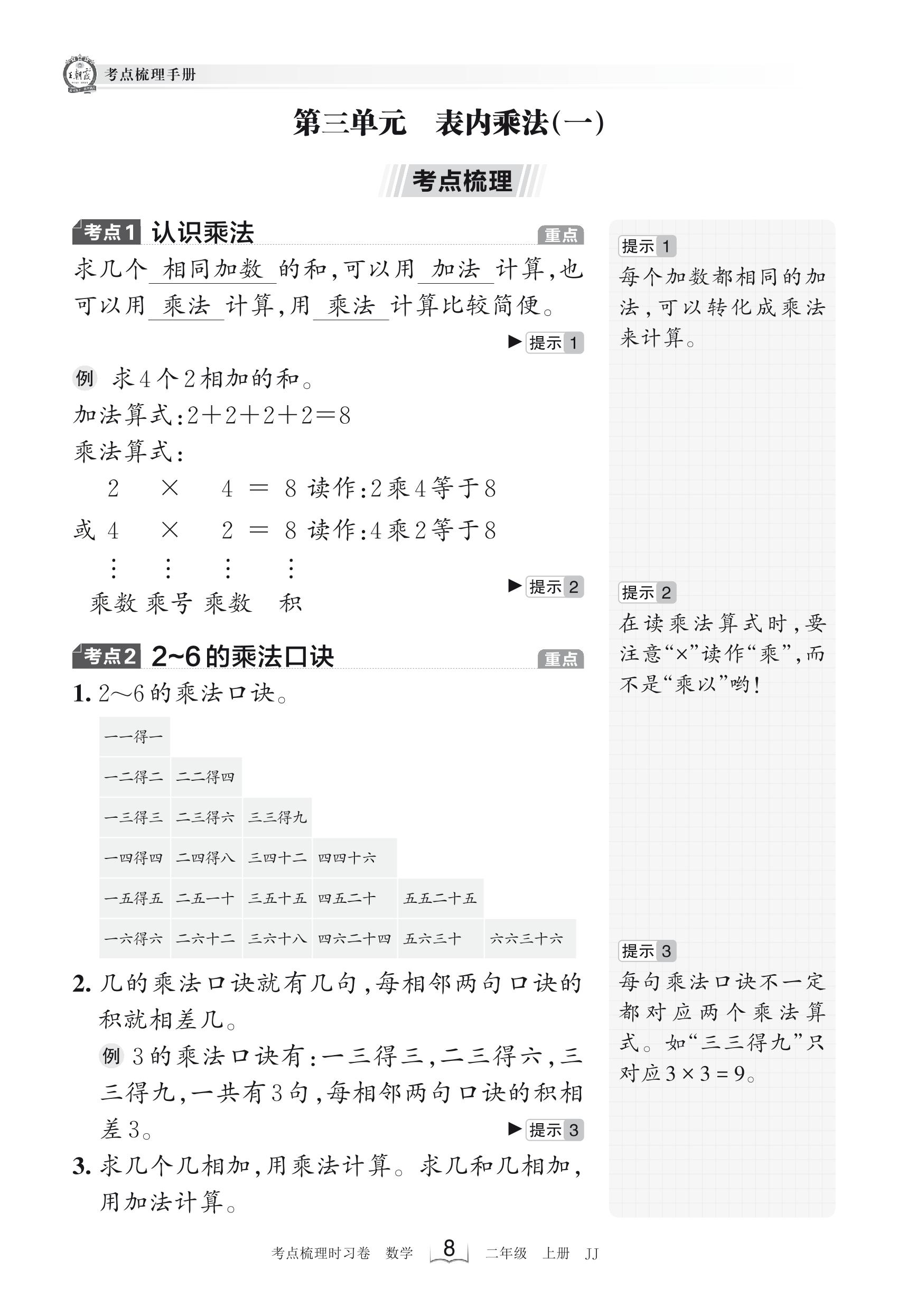 2023上册二年级数学冀教版 考点梳理手册——第三单元 表内乘法(一)