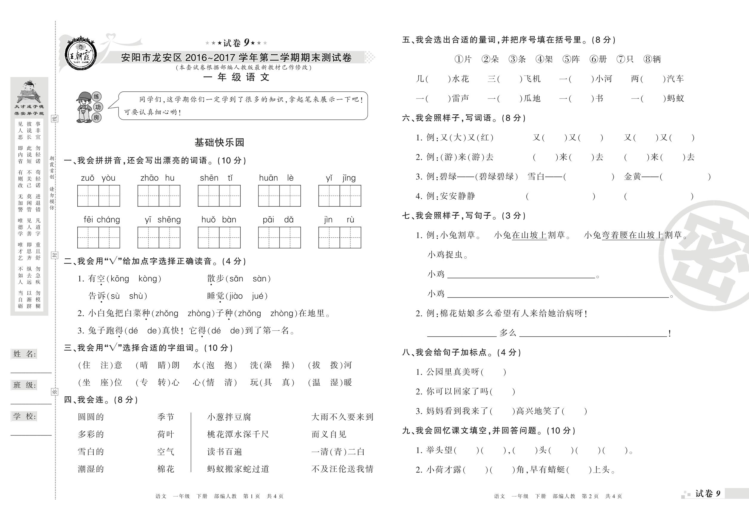 2016-2017学年第二学期安阳市龙安区一年级语文试卷(人教版)【9】