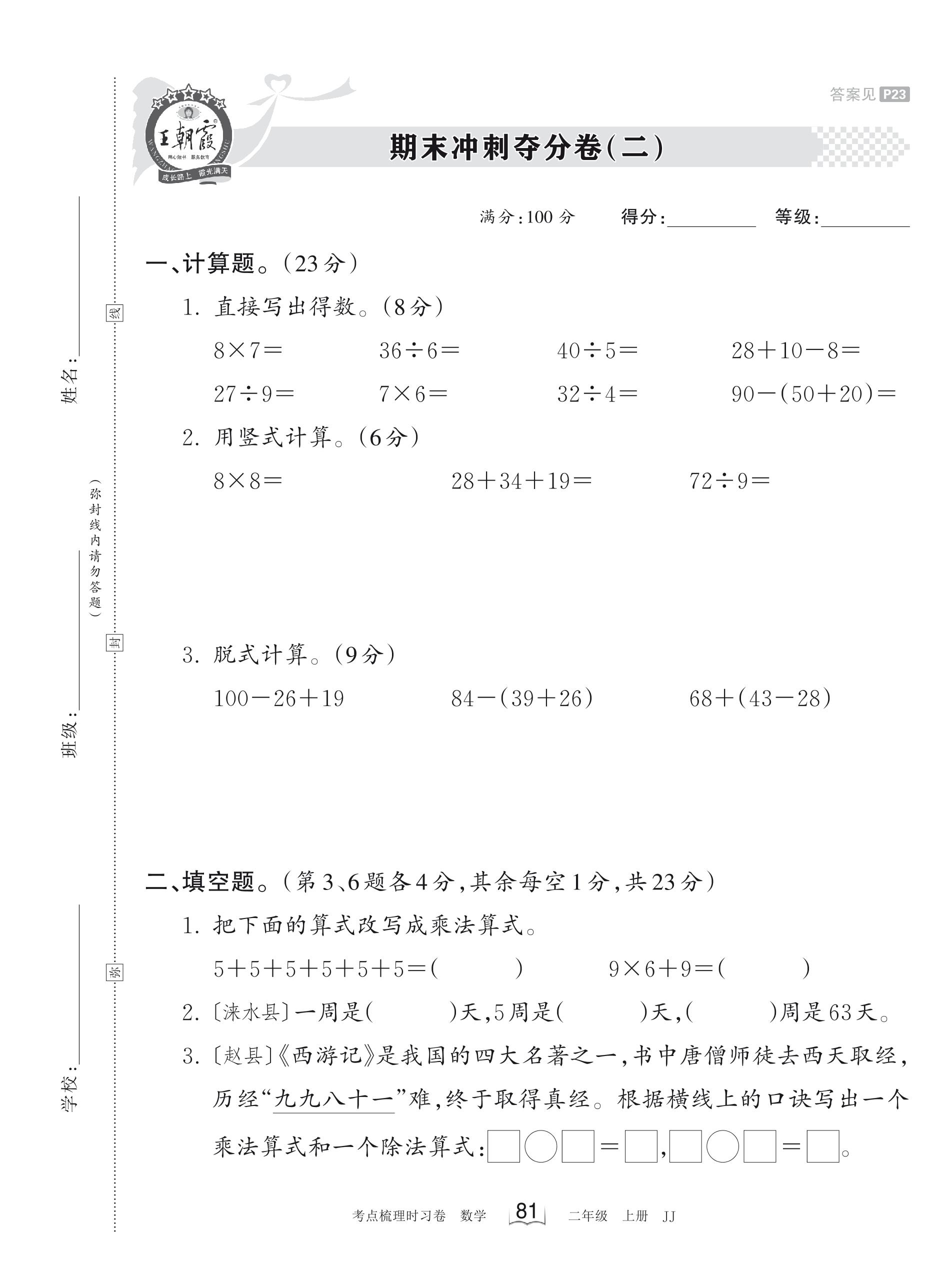 2023上册二年级数学冀教版期末冲刺夺分卷(二)