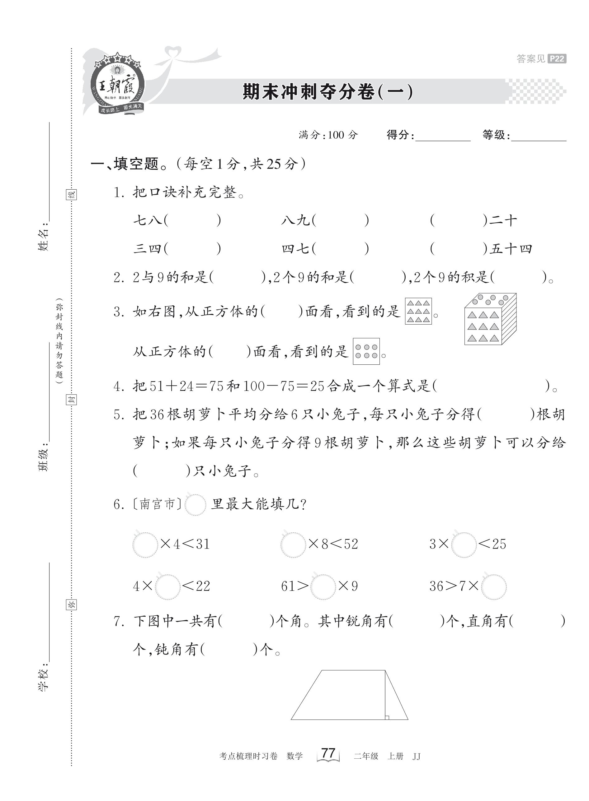 2023上册二年级数学冀教版期末冲刺夺分卷(一)