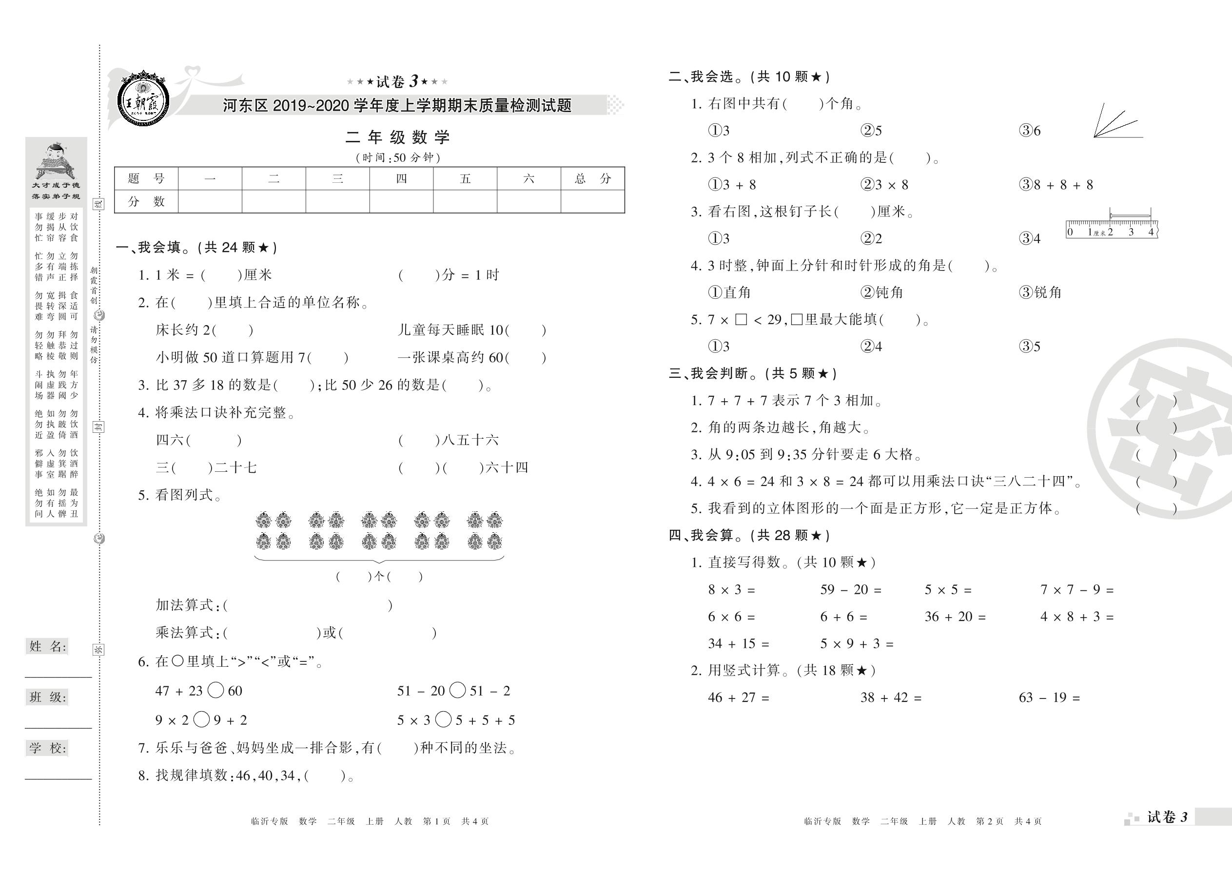2019-2020学年第一学期临沂市河东区二年级数学试卷(人教版)【3】