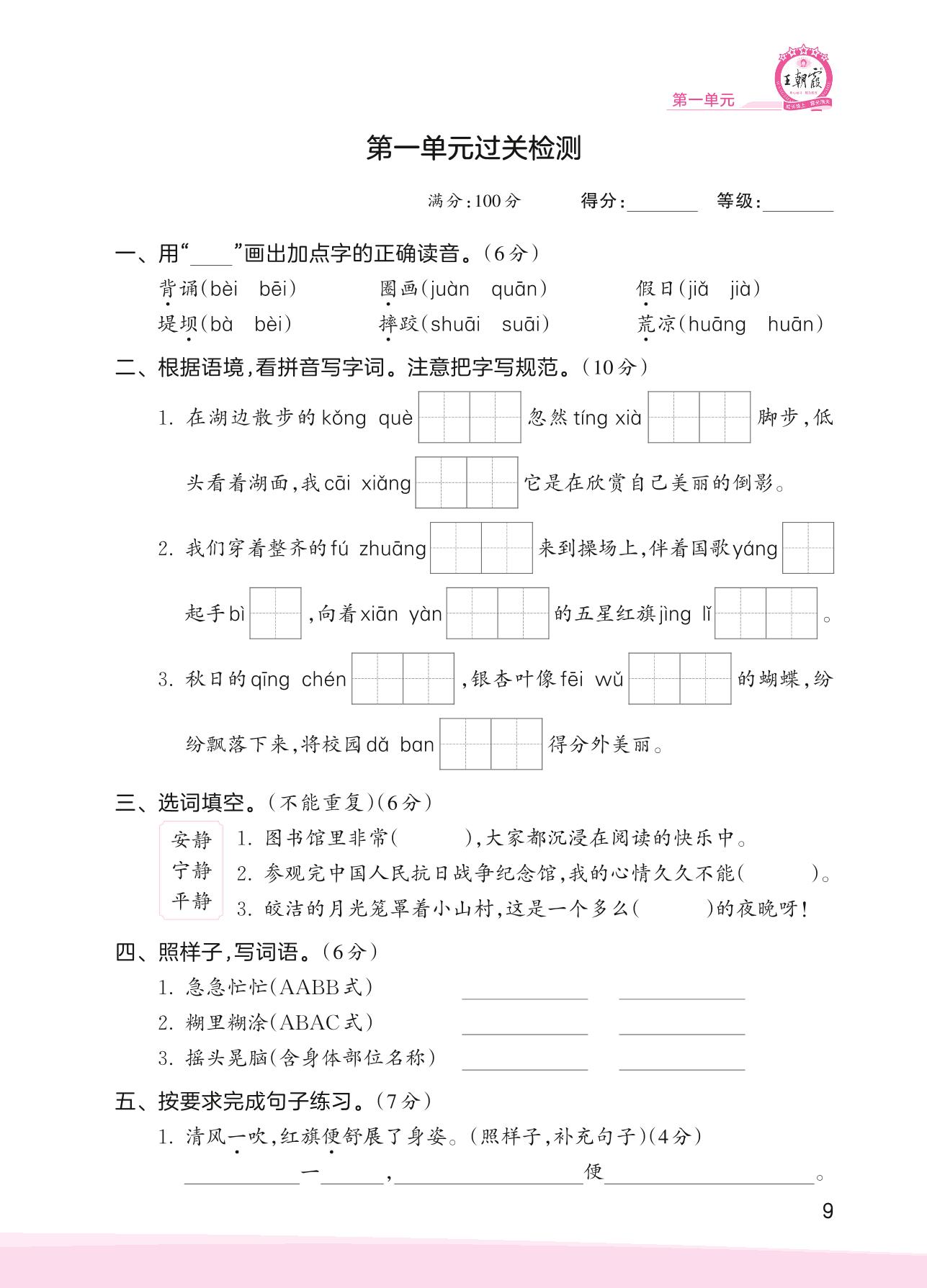 2023上册三年级语文人教版 第一单元过关检测