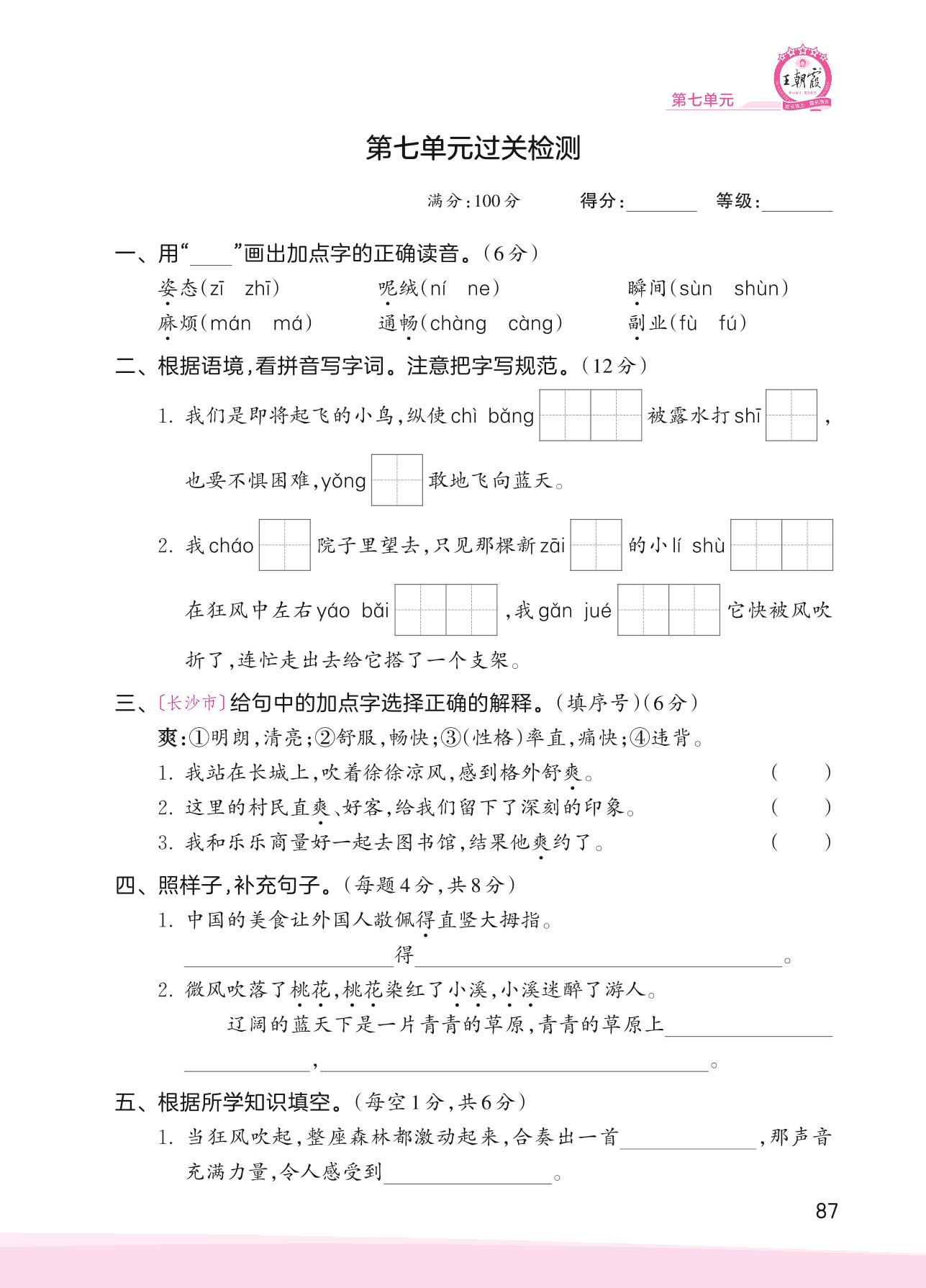 2023上册三年级语文人教版 第七单元过关检测