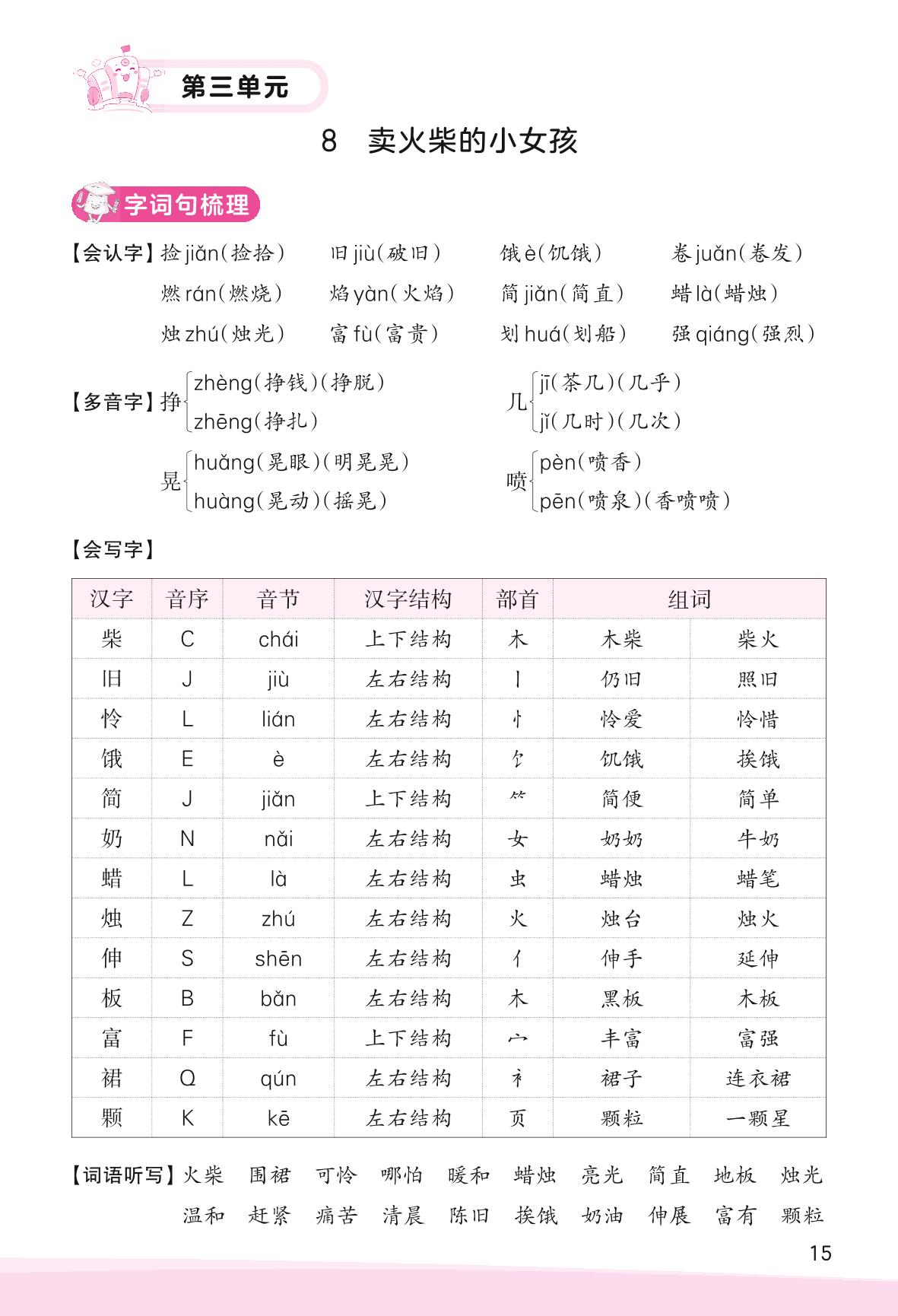 2023上册三年级语文人教版 助学手册 第三单元——8 卖火柴的小女孩