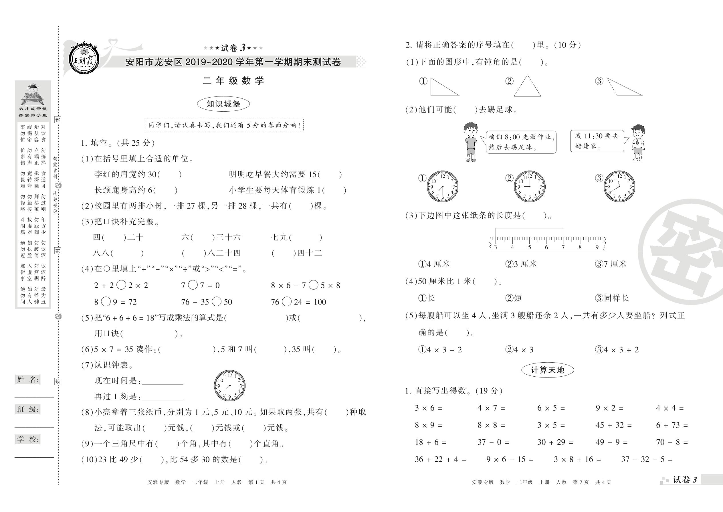 2019-2020学年第一学期安阳市龙安区二年级数学试卷(人教版)【3】