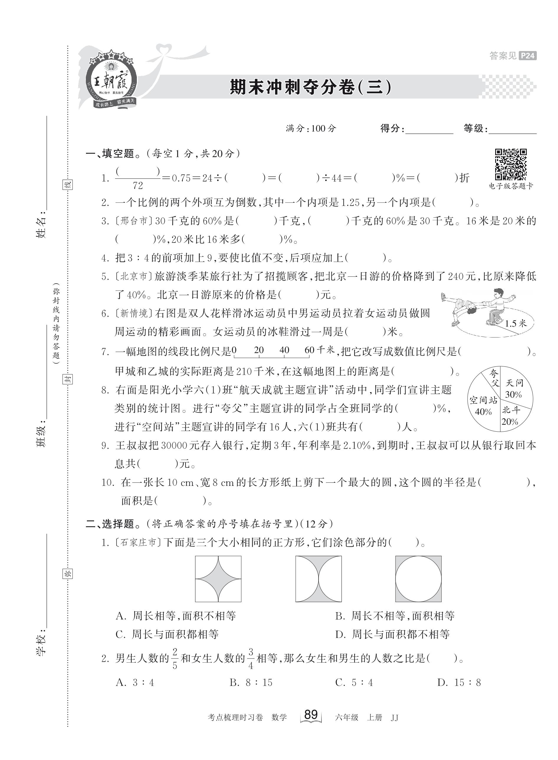 2023上册六年级数学冀教版 期末冲刺夺分卷(三)