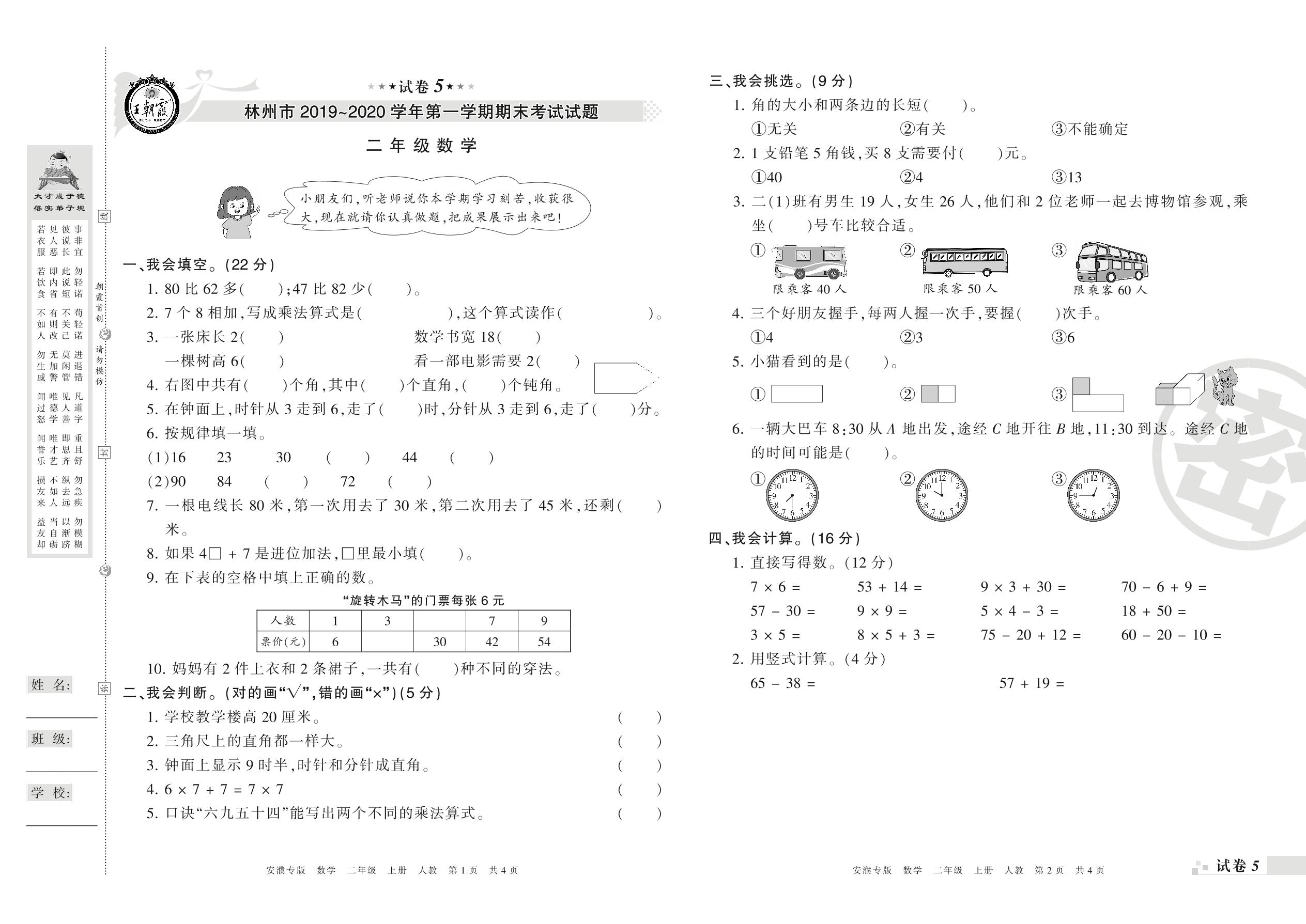2019-2020学年第一学期林州市二年级数学试卷(人教版)【5】