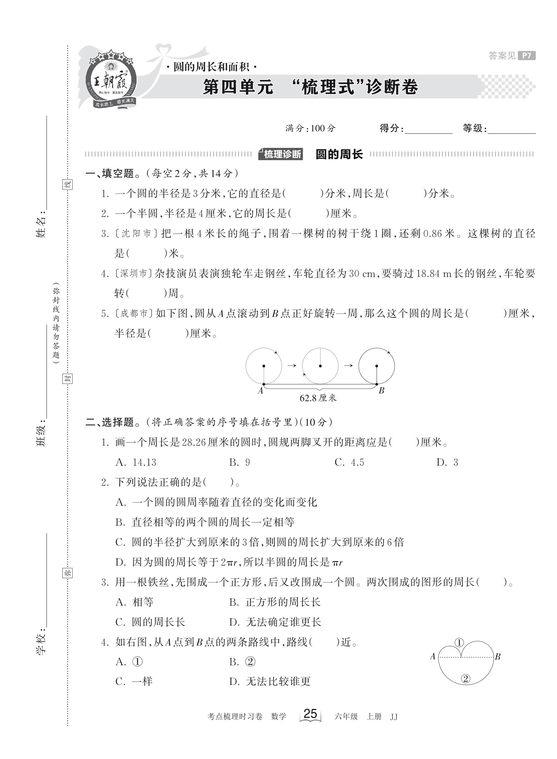 2023上册六年级数学冀教版 第四单元 “梳理式”诊断卷