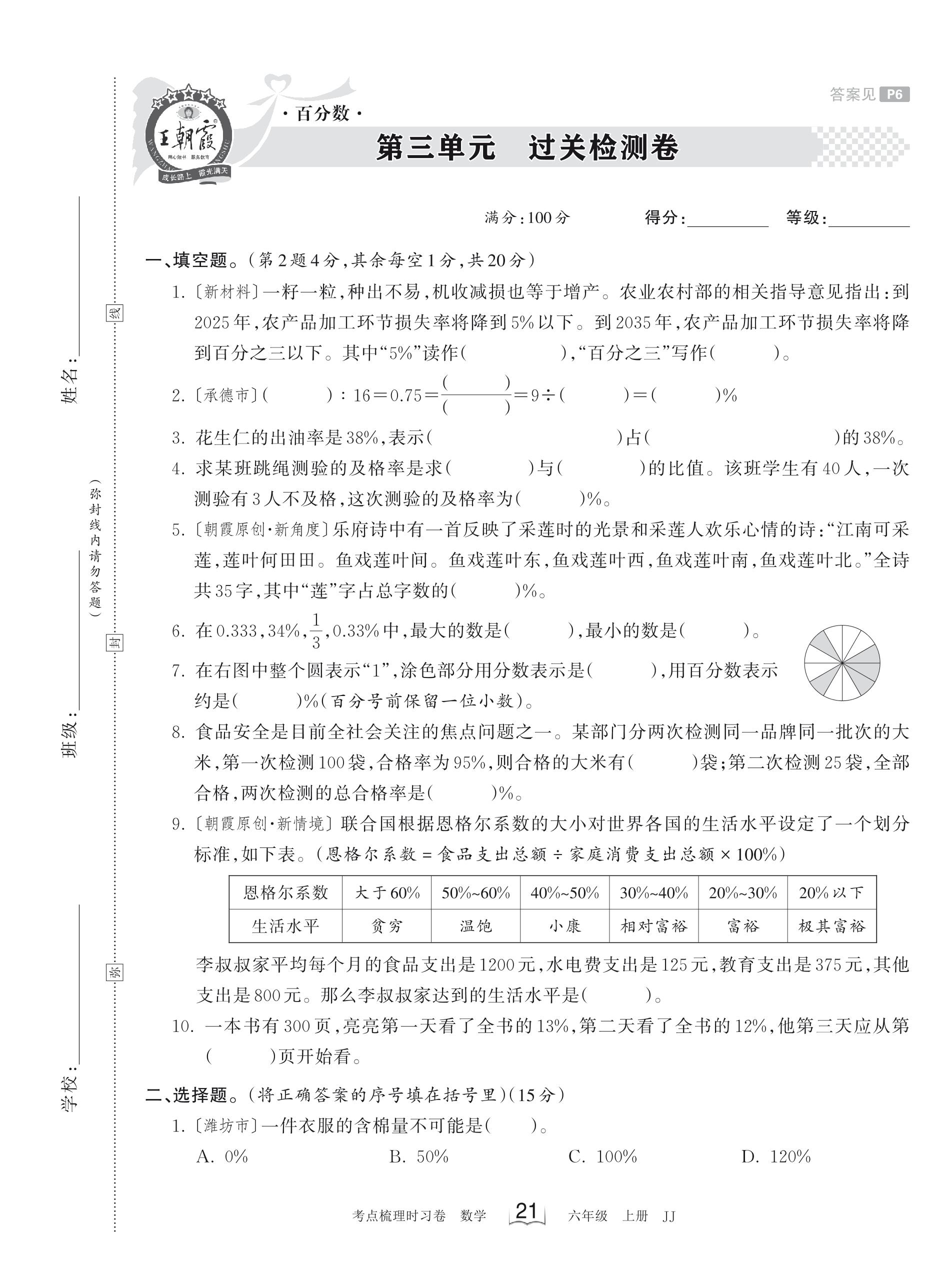 2023上册六年级数学冀教版 第三单元 过关检测卷