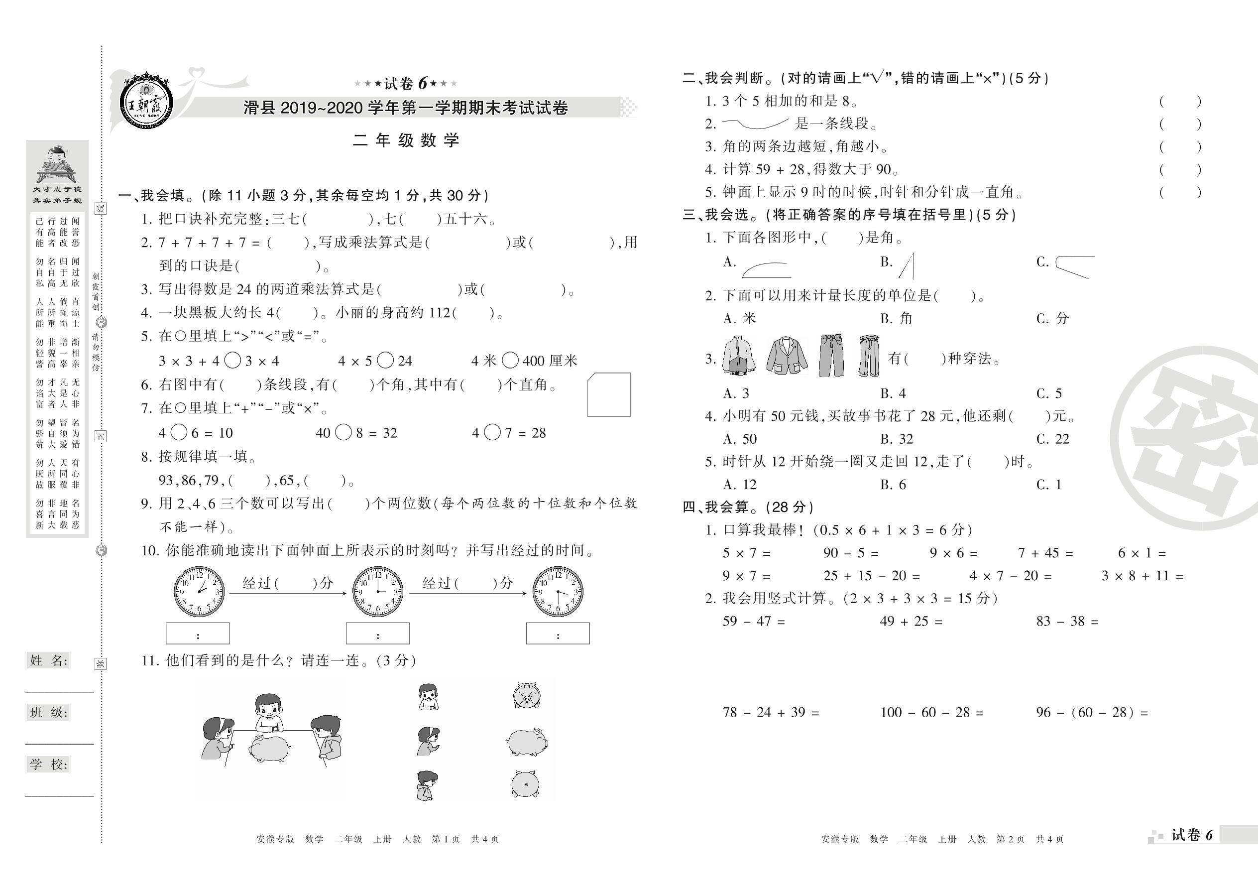 2019-2020学年第一学期安阳市滑县二年级数学试卷(人教版)【6】