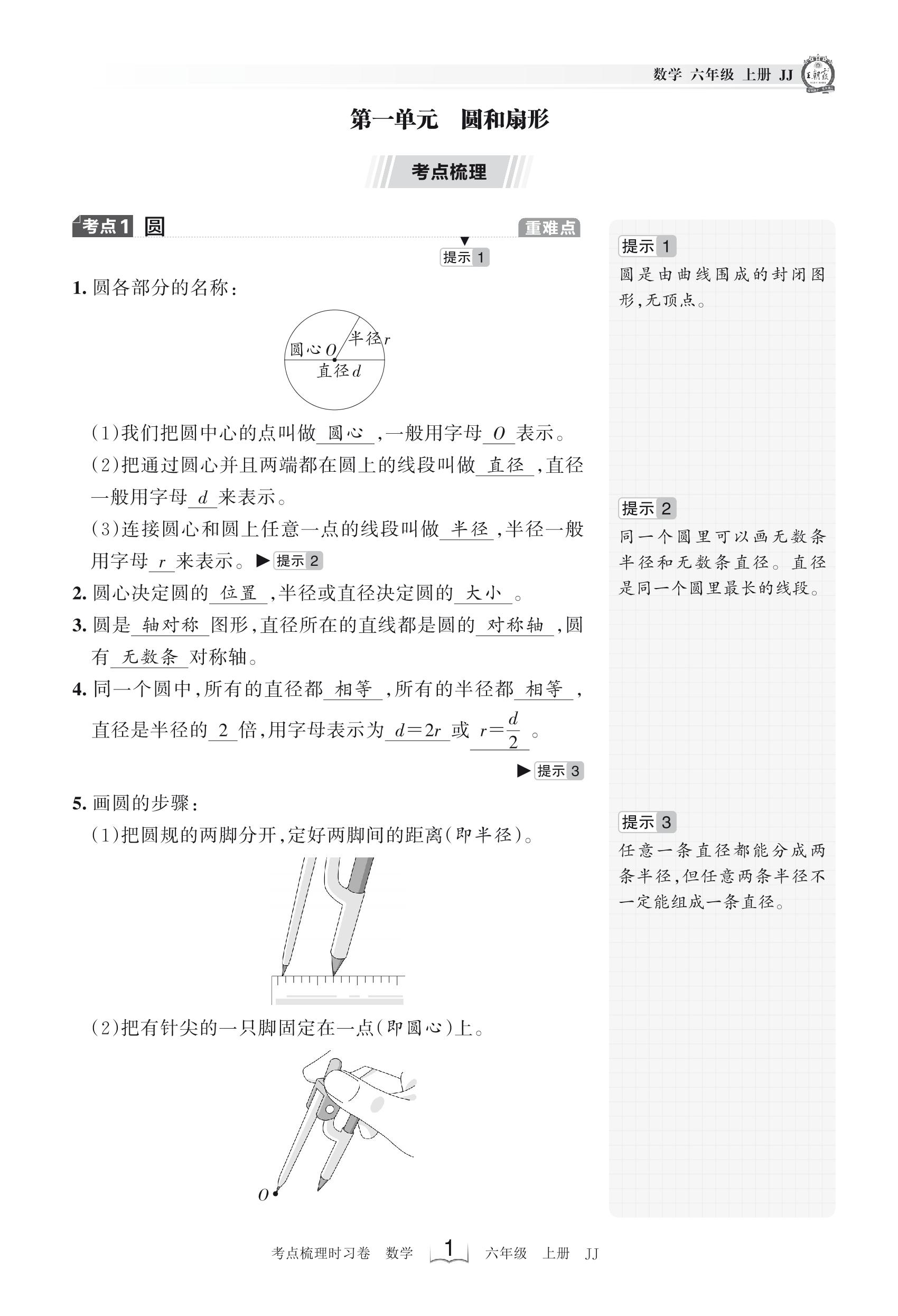 2023上册六年级数学冀教版 考点梳理手册——第一单元 圆和扇形
