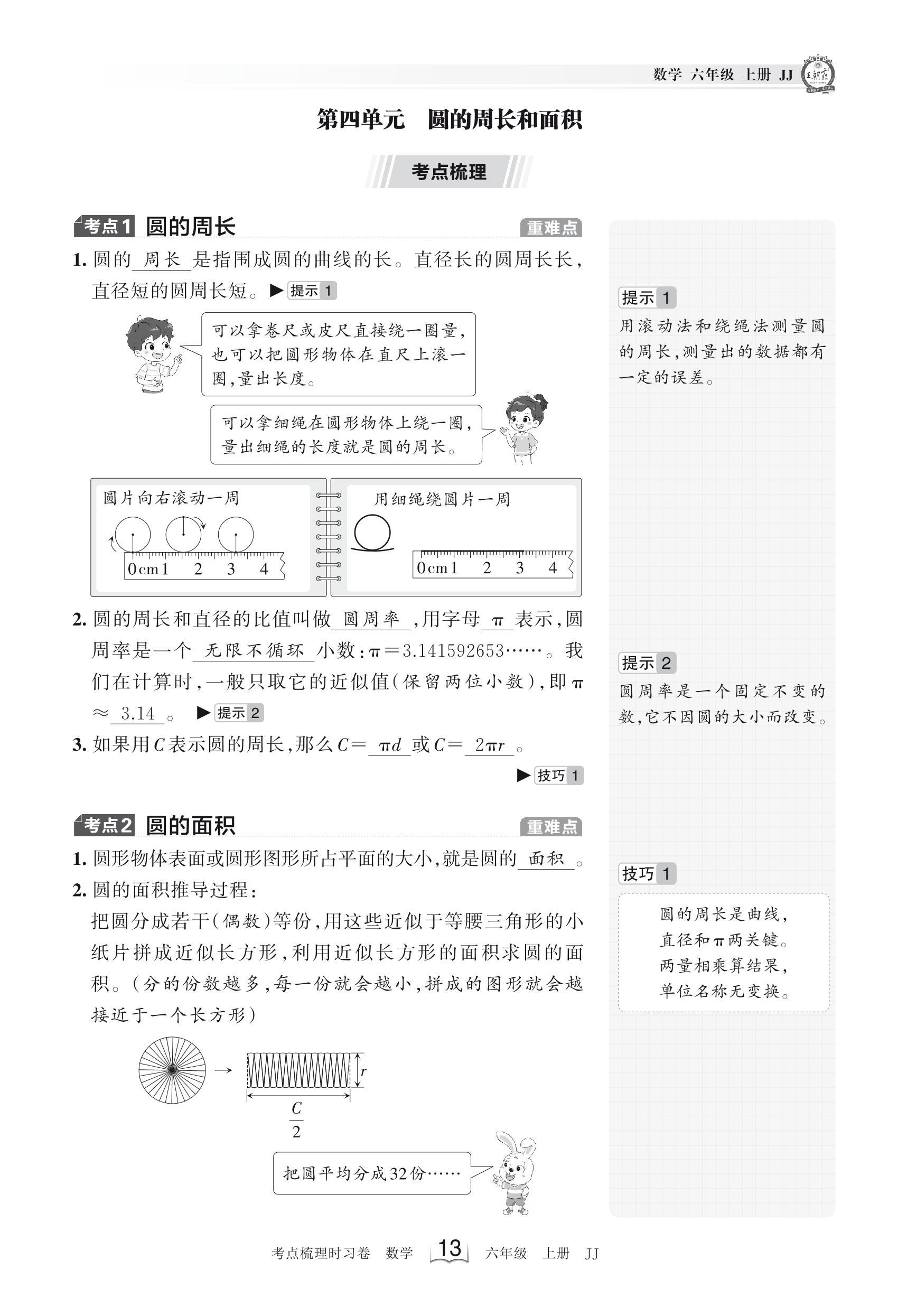 2023上册六年级数学冀教版 考点梳理手册——第四单元 圆的周长和面积
