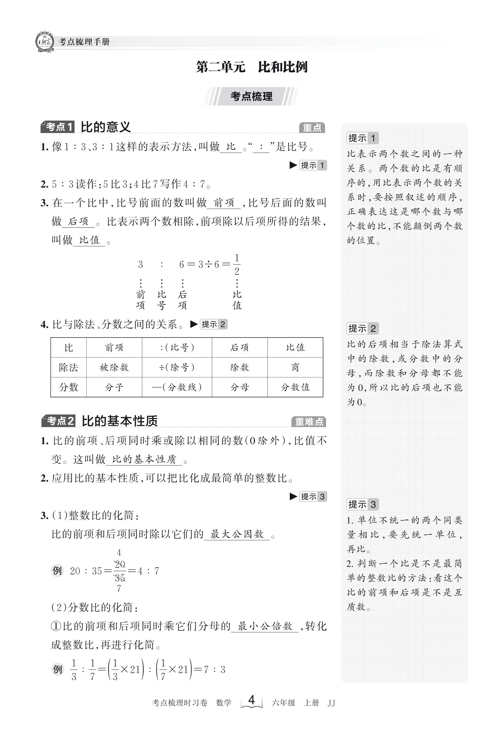 2023上册六年级数学冀教版 考点梳理手册——第二单元 比和比例
