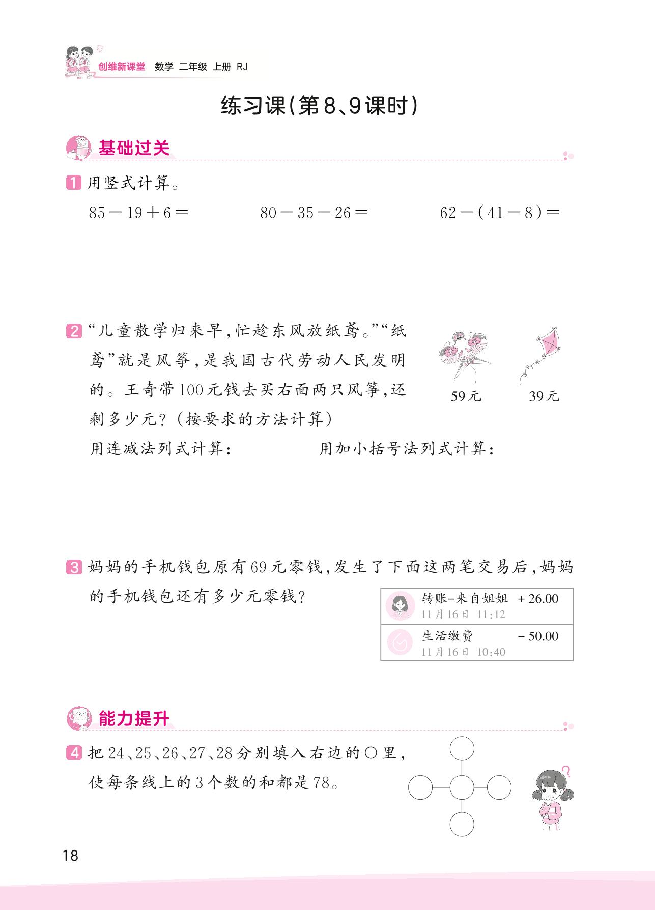 2023上册二年级数学人教版 二 100以内的加法和减法(二)——练习课(第8、9课时)