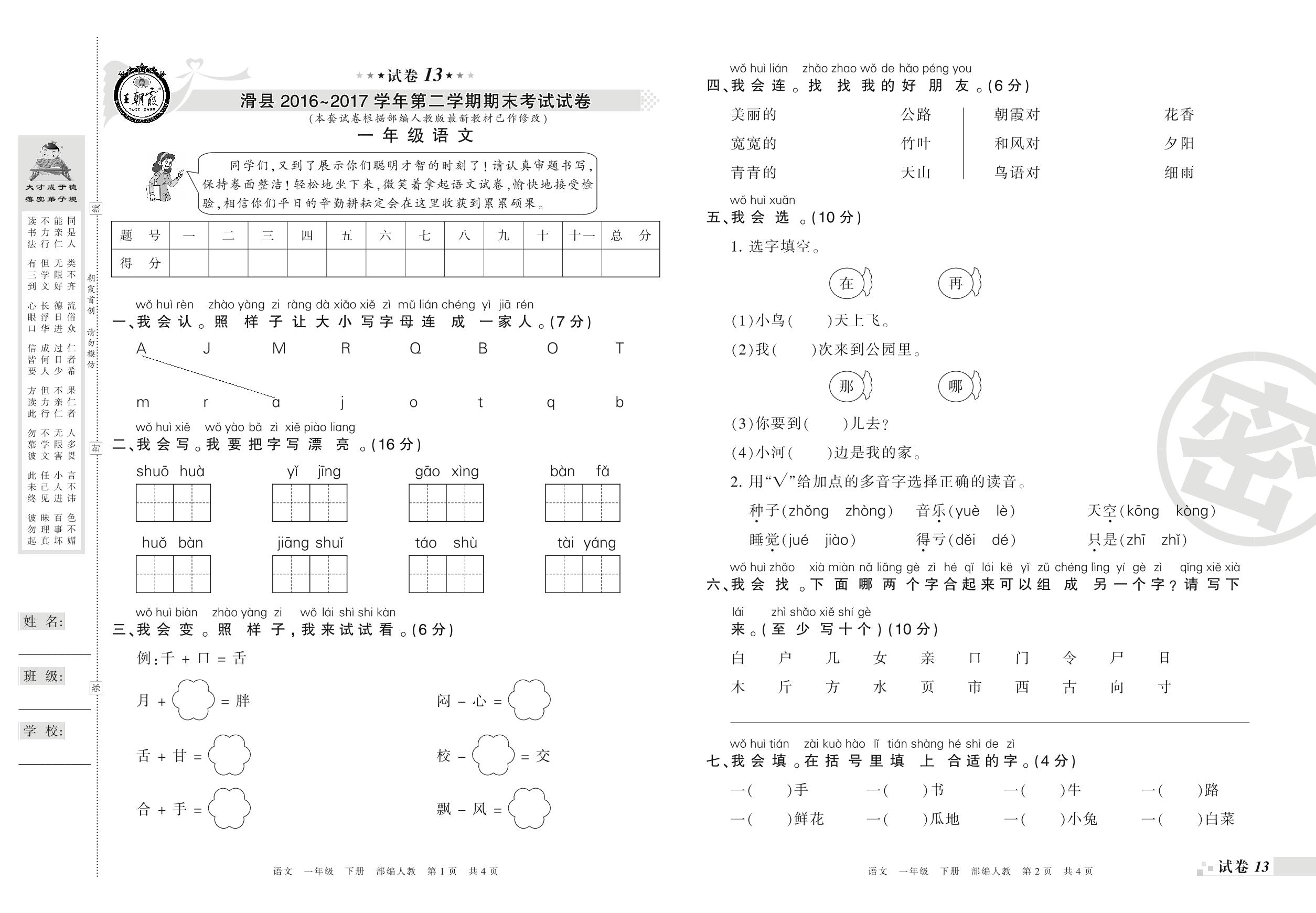 2016-2017学年第二学期安阳市滑县一年级语文试卷(人教版)【13】