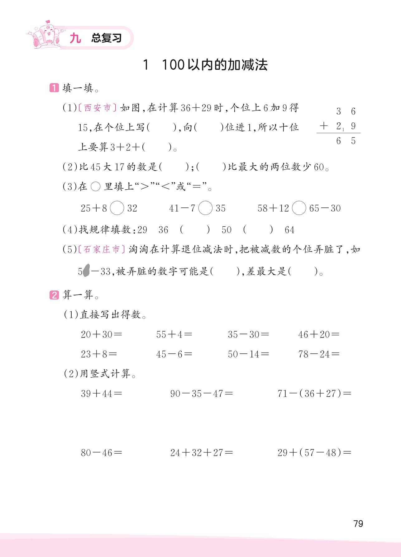 2023上册二年级数学人教版 九 总复习——1 100以内的加减法