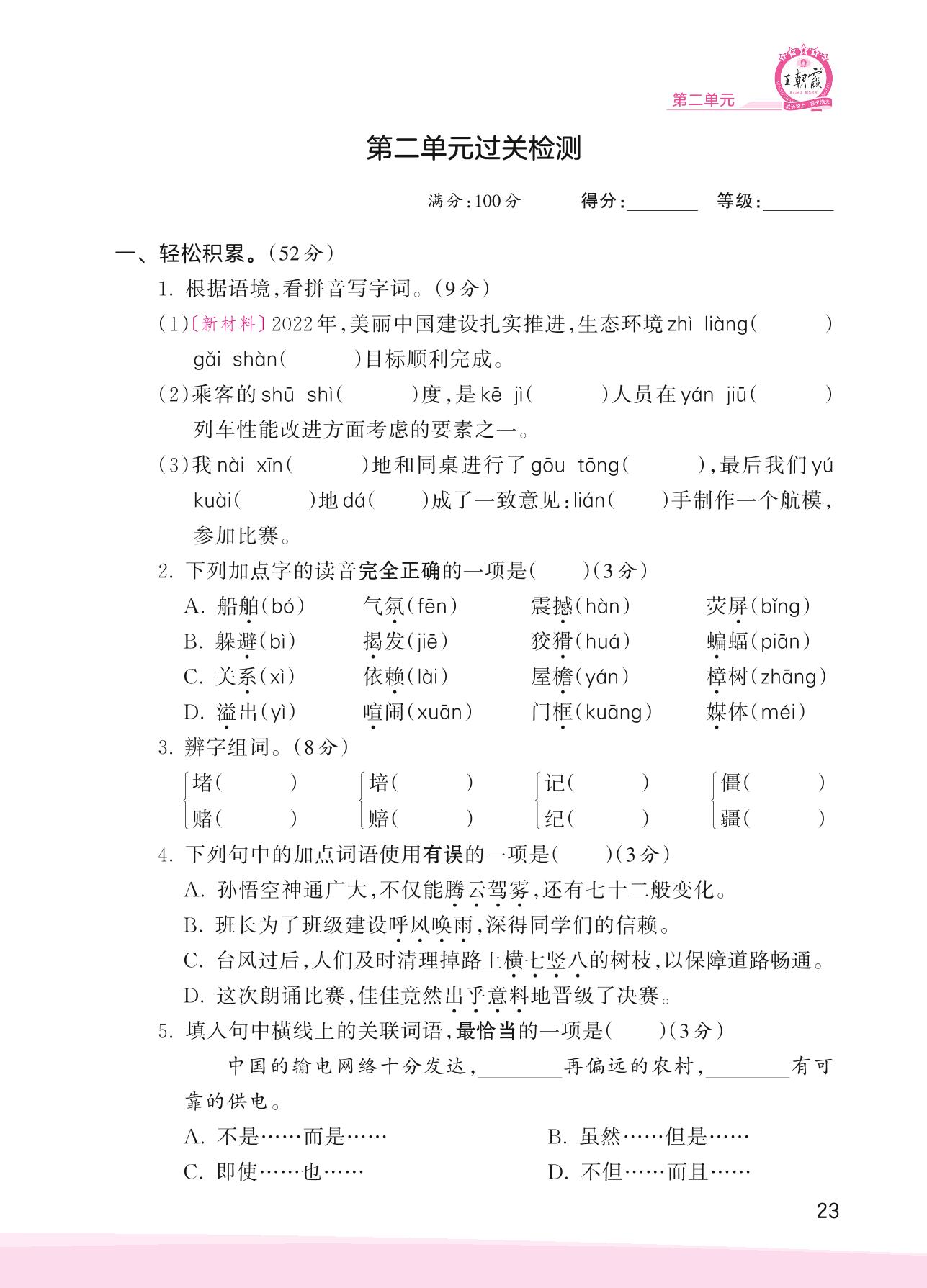 2023上册四年级语文人教版 第二单元过关检测