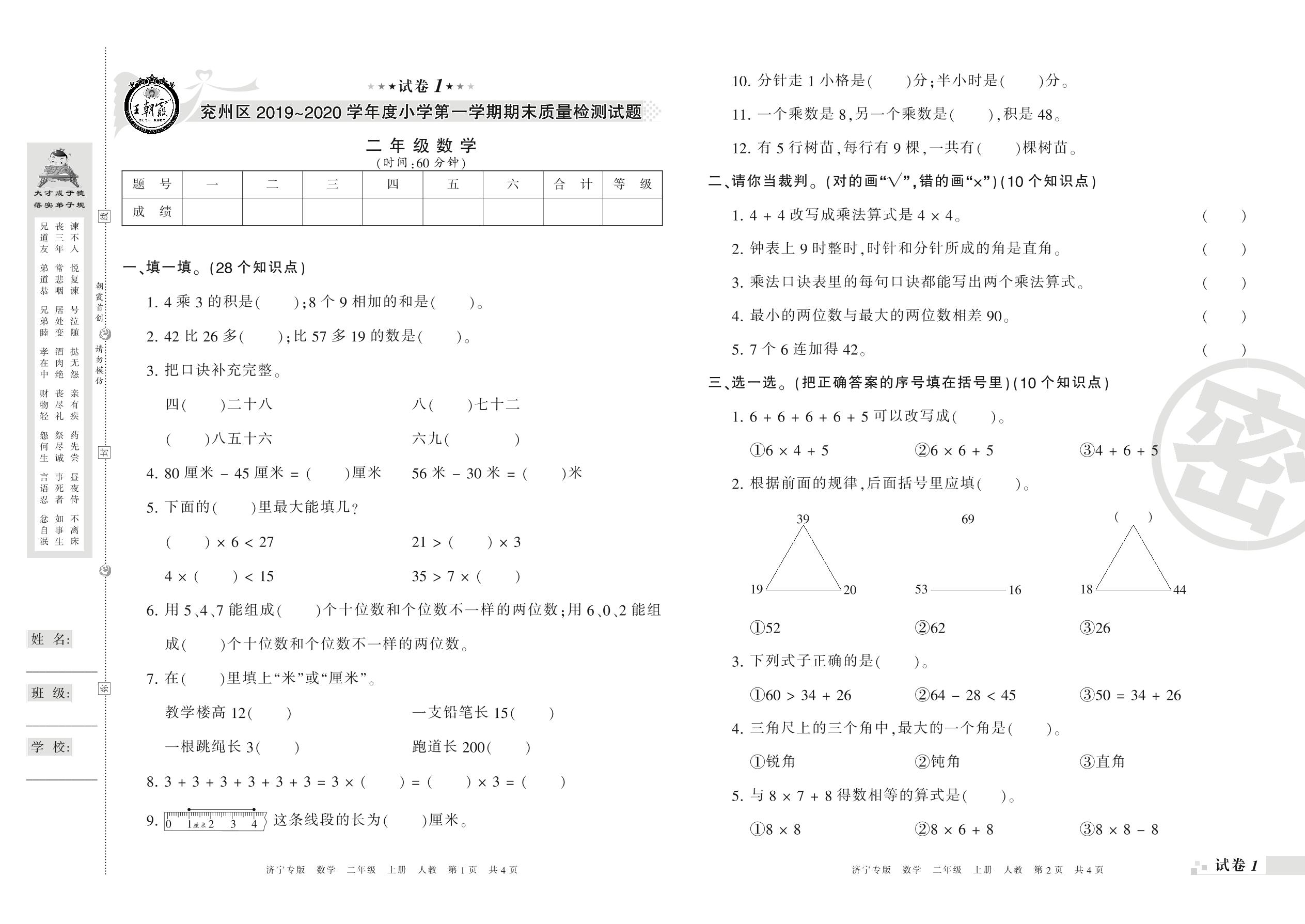 2019-2020学年第一学期济宁市兖州区二年级数学试卷(人教版)【1】