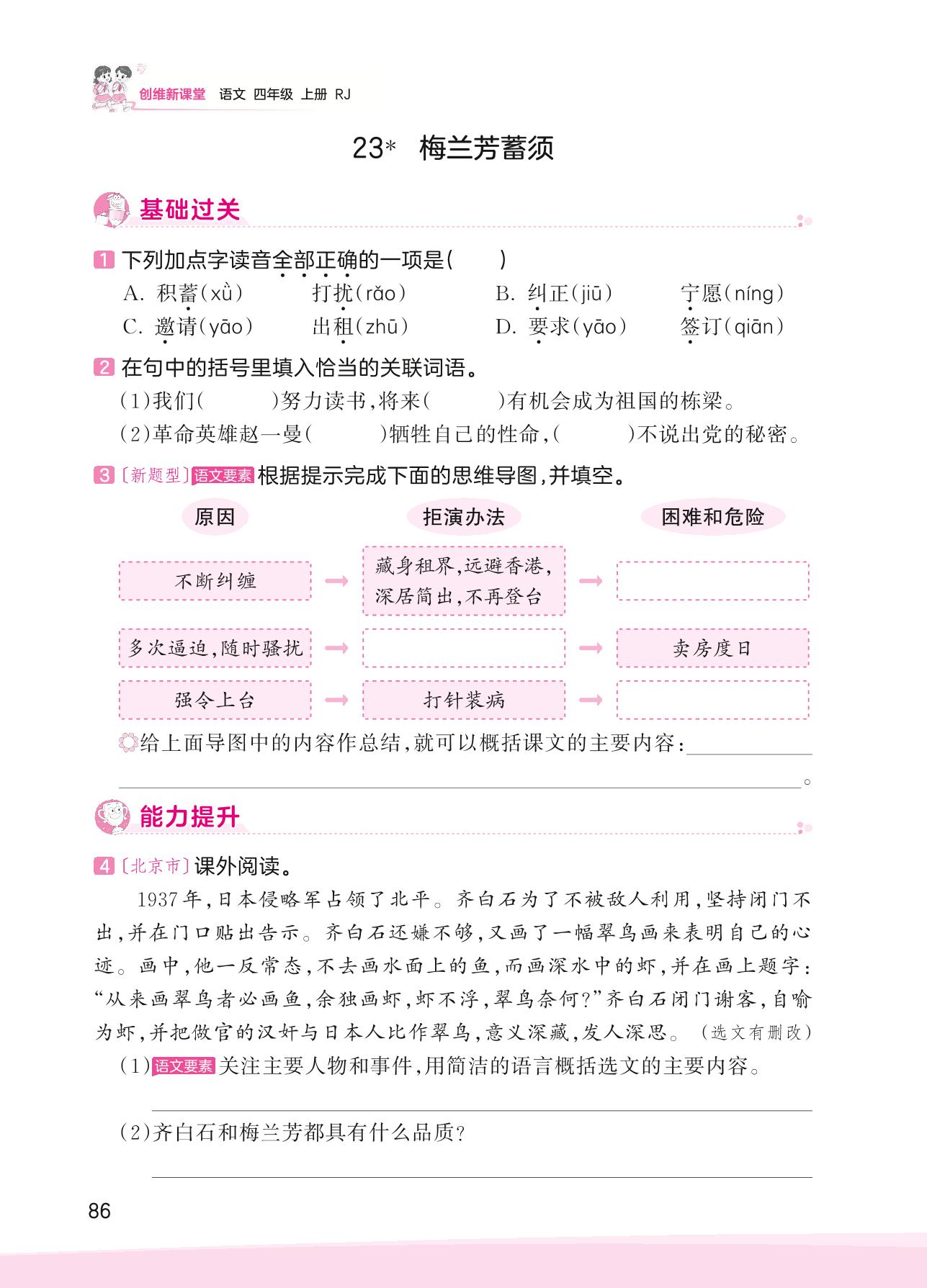 2023上册四年级语文人教版 第七单元 家国情怀——23 梅兰芳蓄须