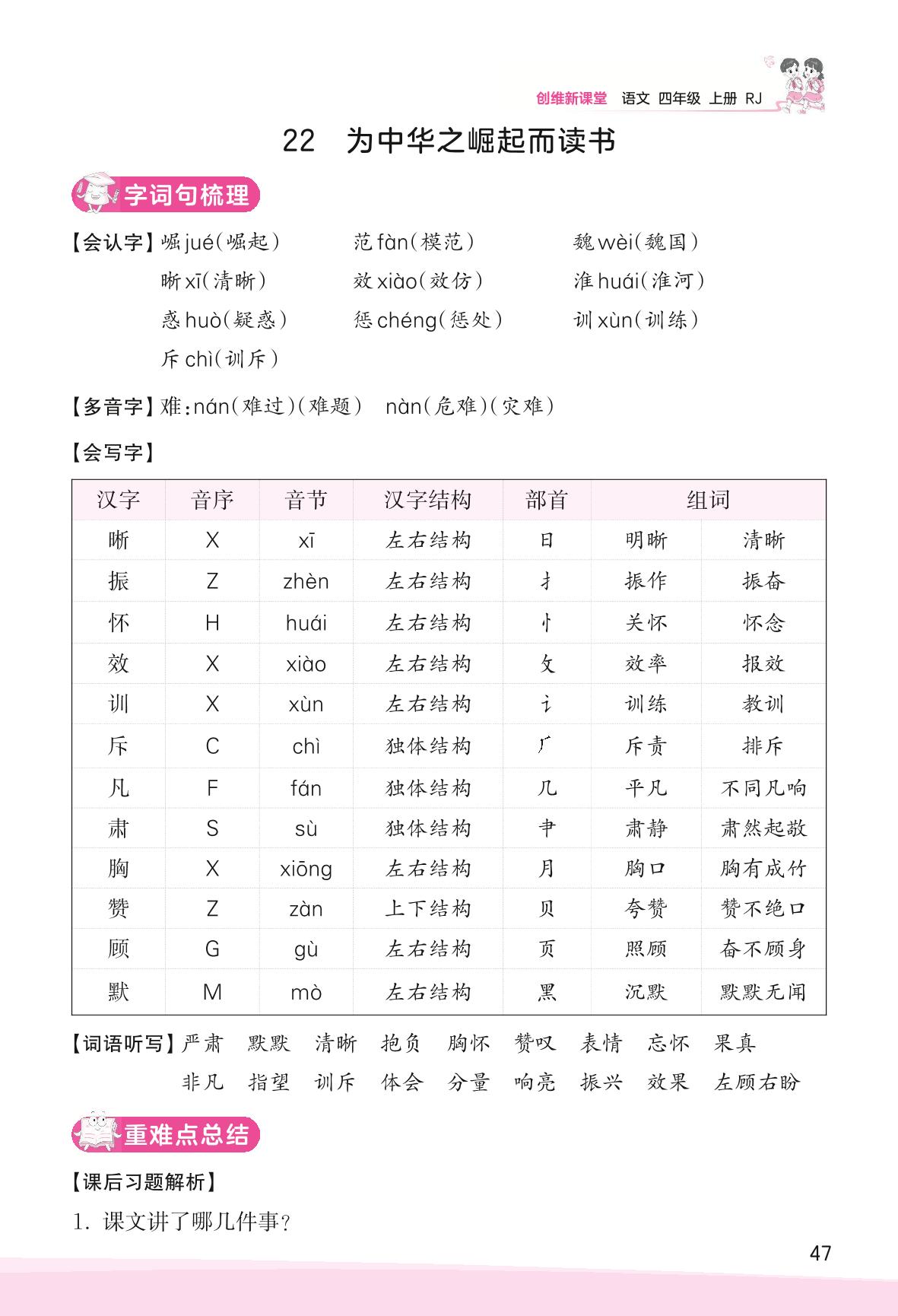 2023上册四年级语文人教版 助学手册 第七单元——22 为中华之崛起而读书