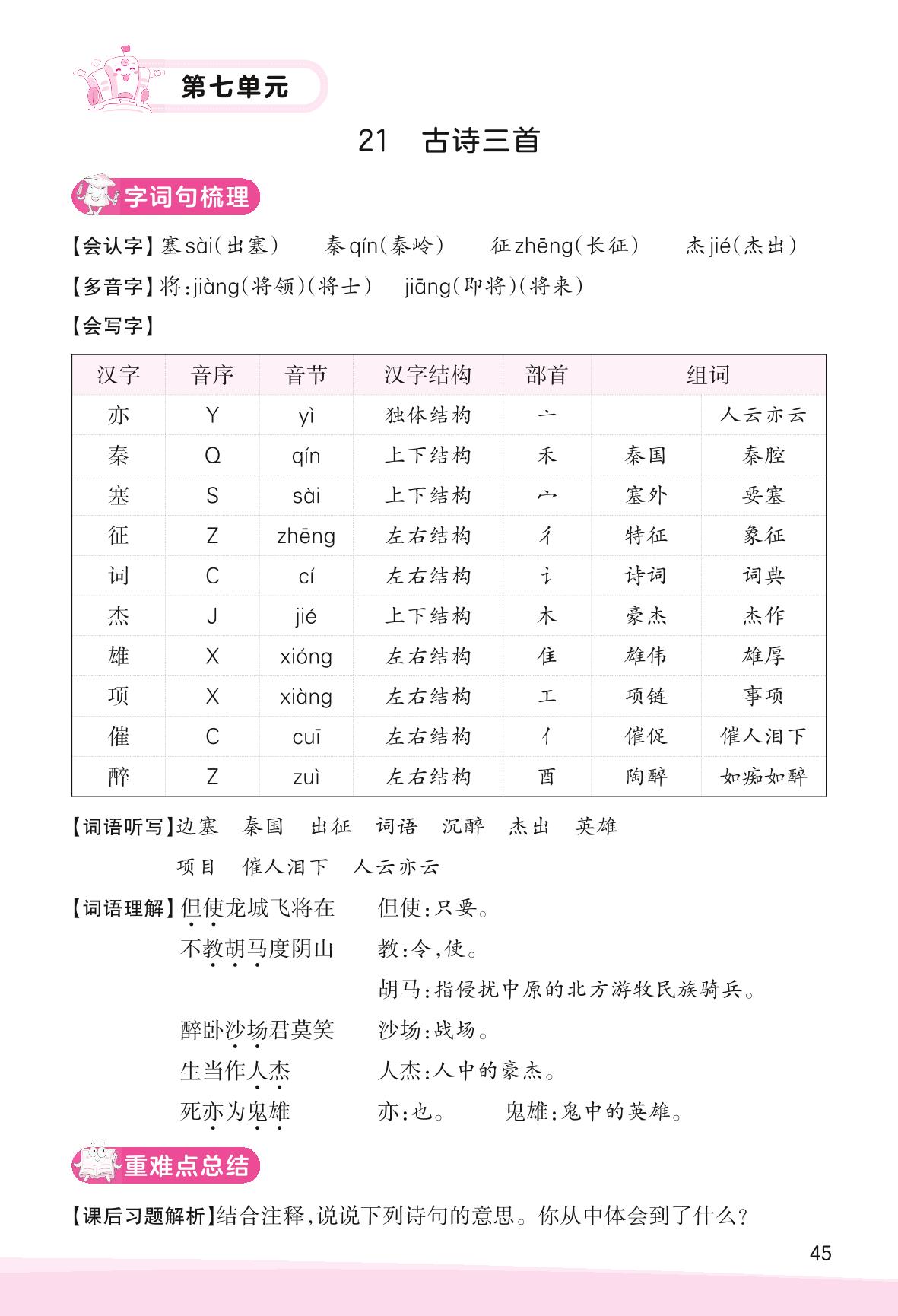 2023上册四年级语文人教版 助学手册 第七单元——21 古诗三首