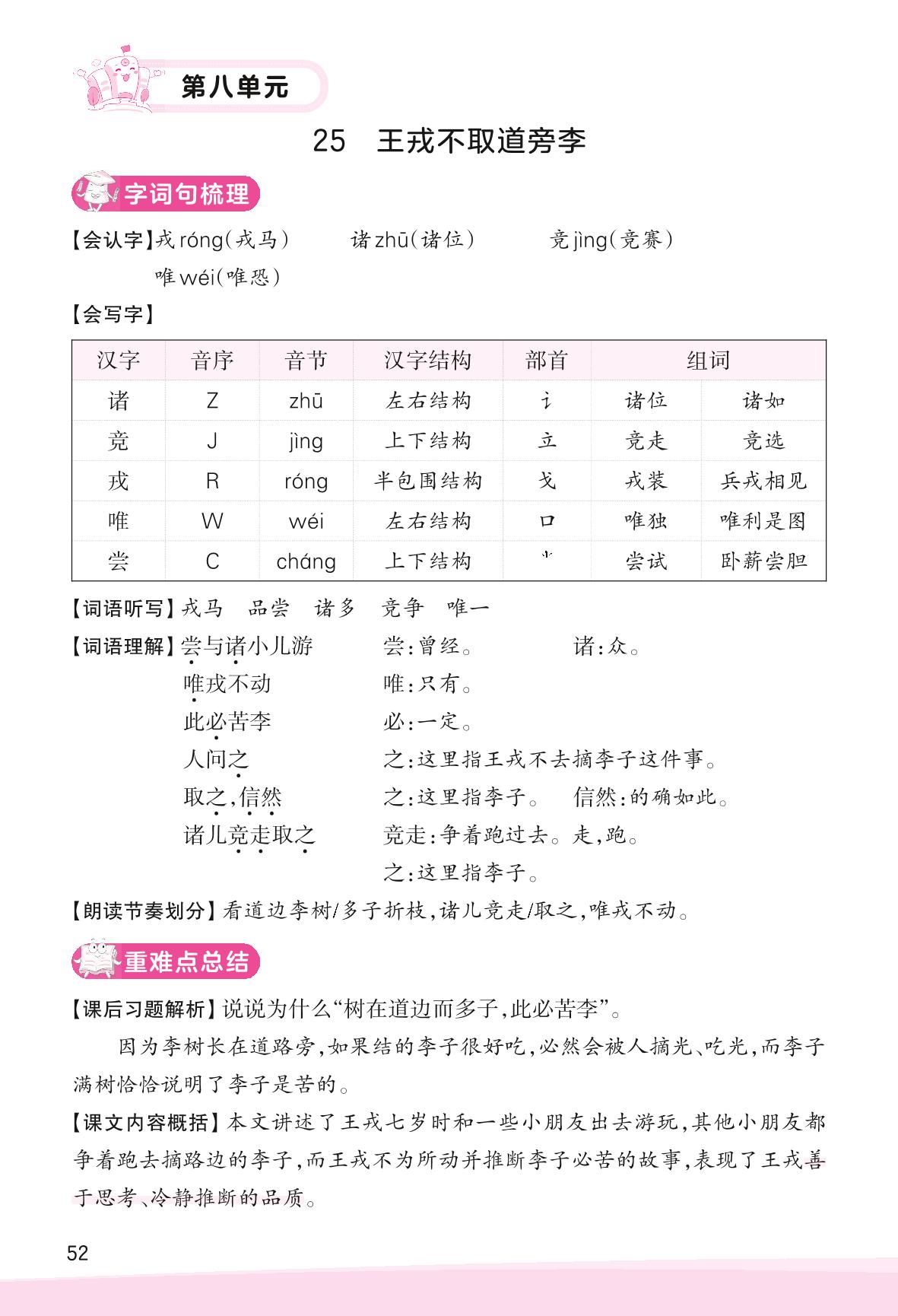 2023上册四年级语文人教版 助学手册 第八单元——25 王戎不取道旁李
