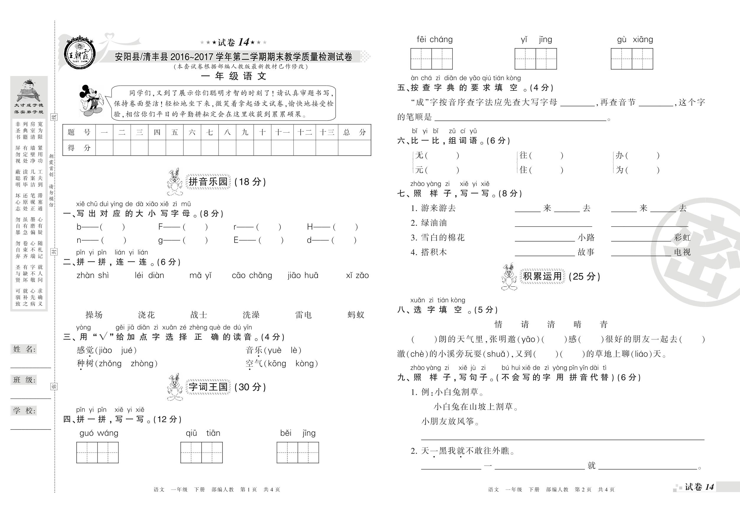 2016-2017学年第二学期安阳市安阳县清丰县一年级语文试卷(人教版)【14】