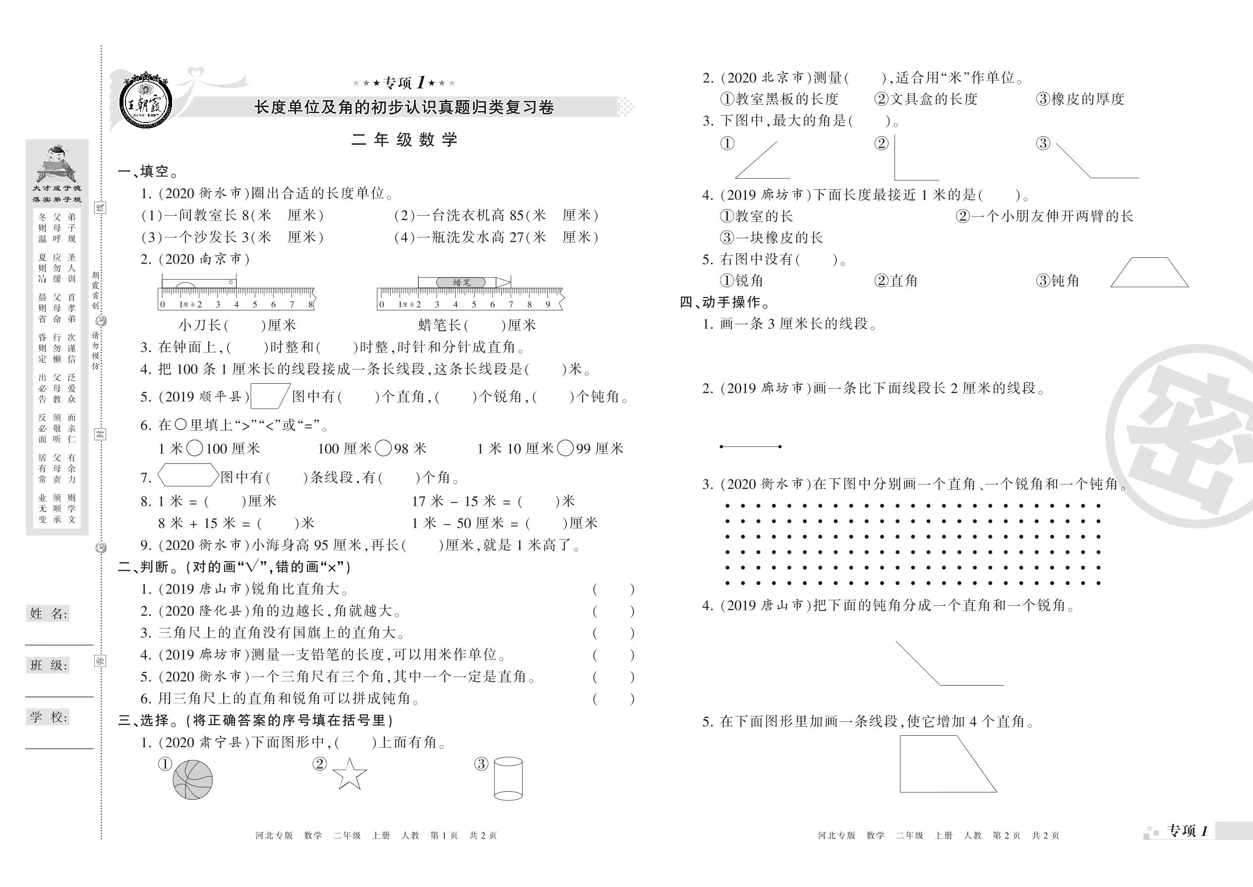 王朝霞期末专项卷——长度单位及角的初步认识、100以内的加法和减法真题归类复习二年级上册数学(人教版)【0】