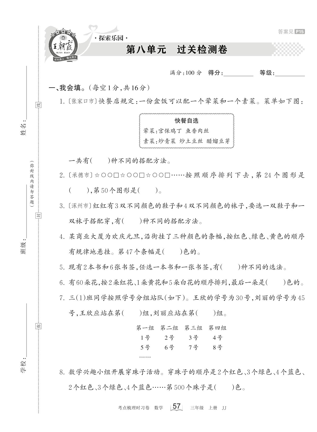 2023上册三年级数学冀教版 第八单元 过关检测卷