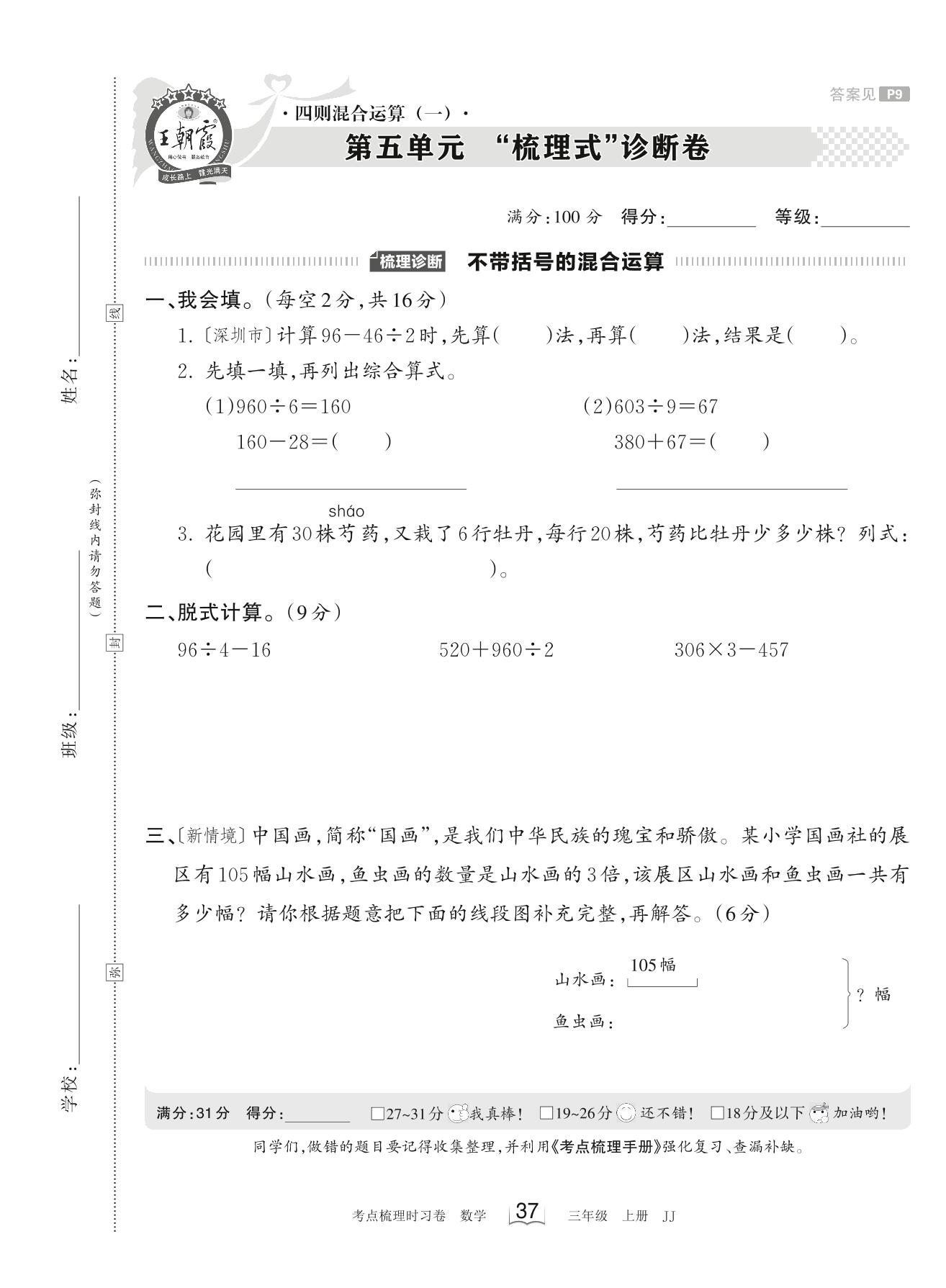 2023上册三年级数学冀教版 第五单元 “梳理式”诊断卷