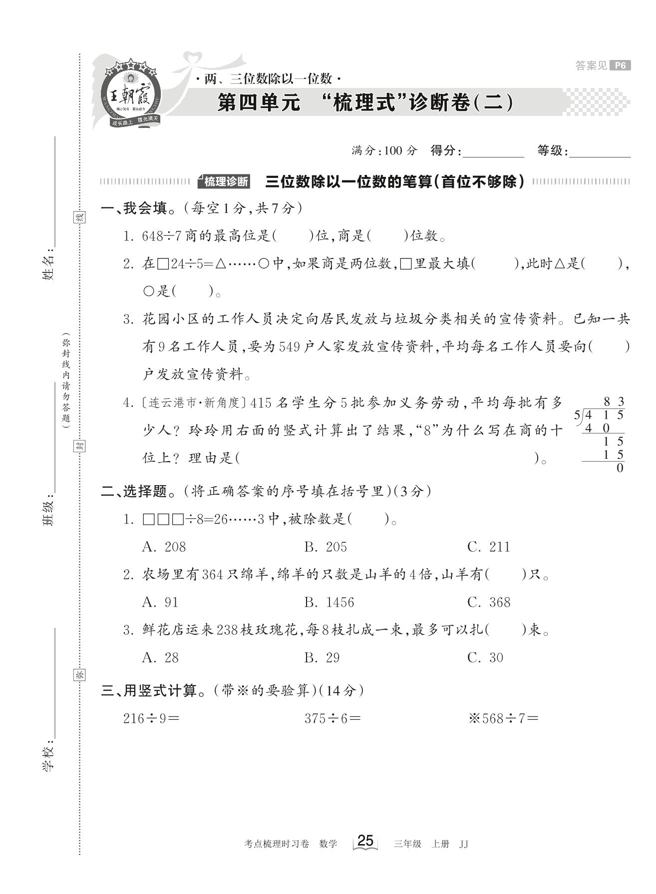 三年级数学冀教版上册单元卷