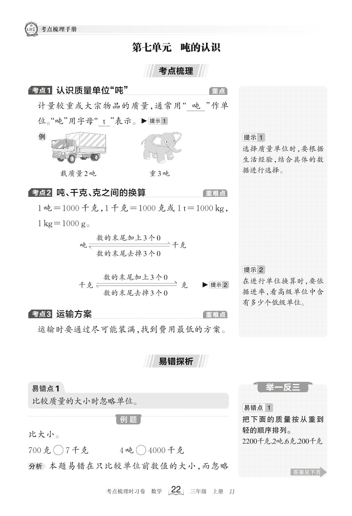 2023上册三年级数学冀教版 考点梳理手册——第七单元 吨的认识