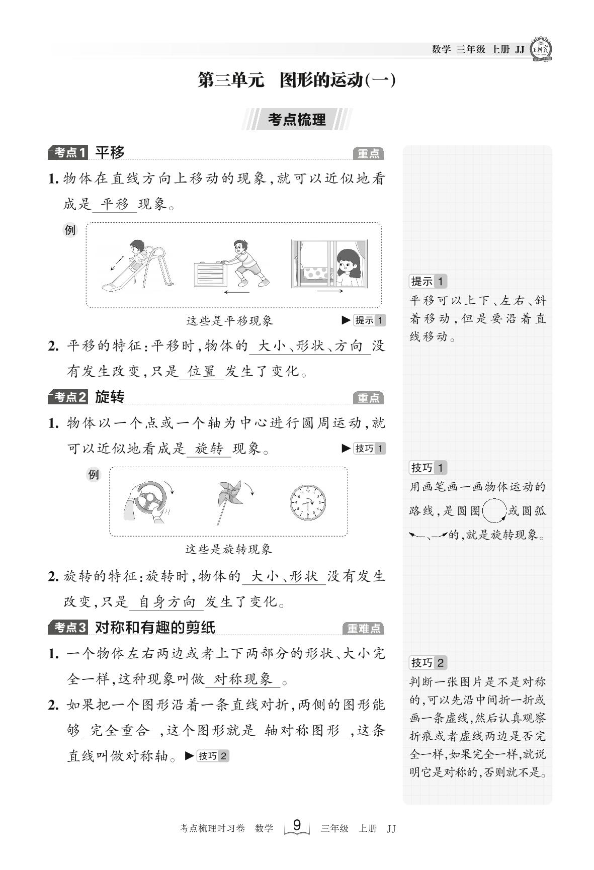 2023上册三年级数学冀教版 考点梳理手册——第三单元 图形的运动(一)