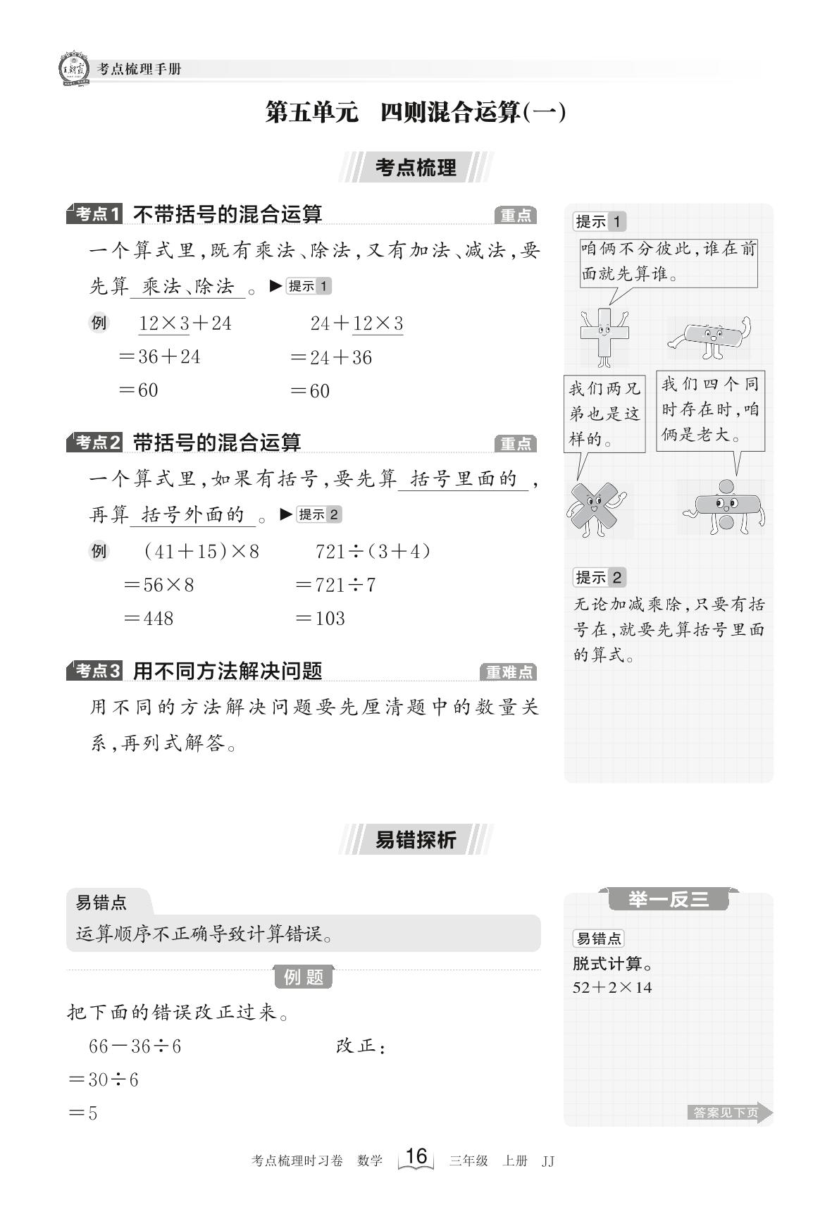 2023上册三年级数学冀教版 考点梳理手册——第五单元 四则混合运算(一)