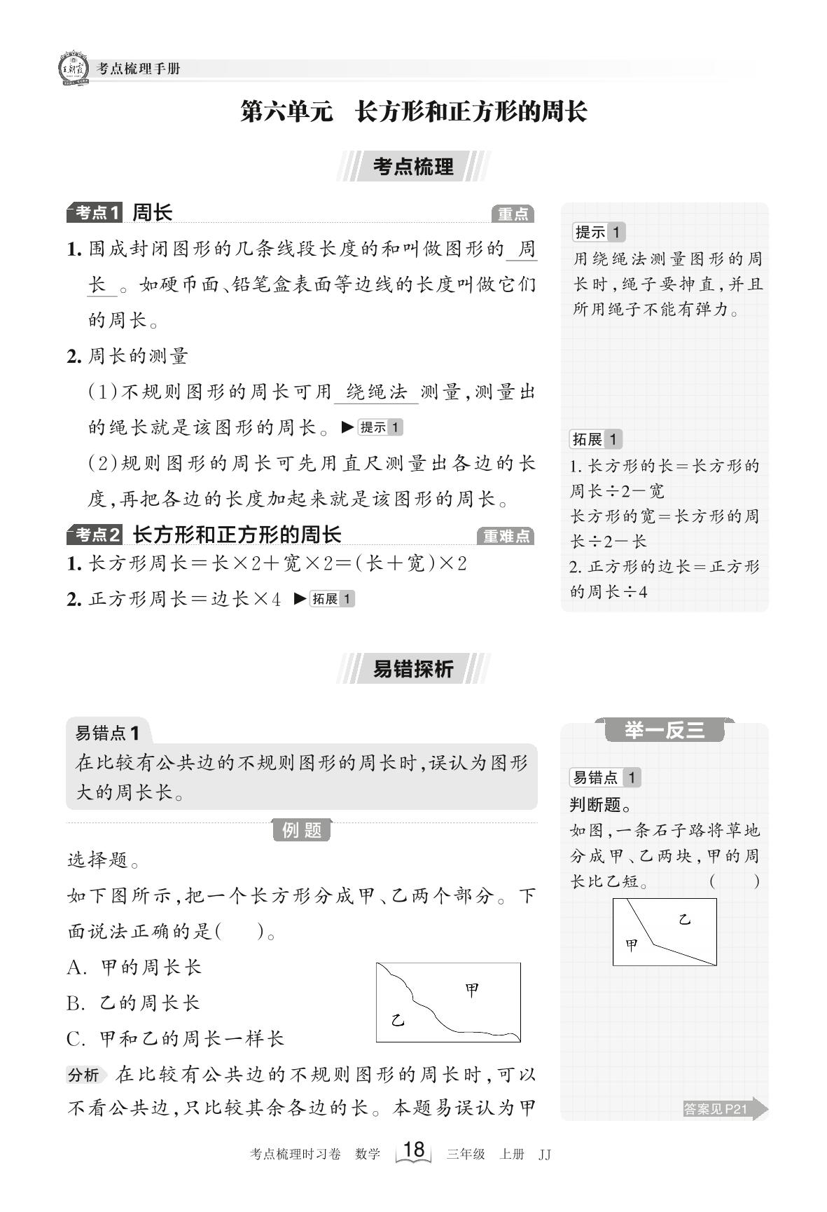 2023上册三年级数学冀教版 考点梳理手册——第六单元 长方形和正方形的周长