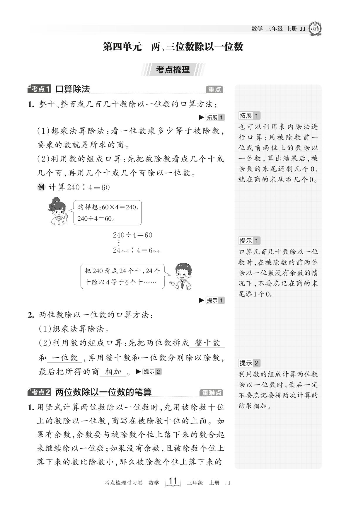 2023上册三年级数学冀教版 考点梳理手册——第四单元 两、三位数除以一位数
