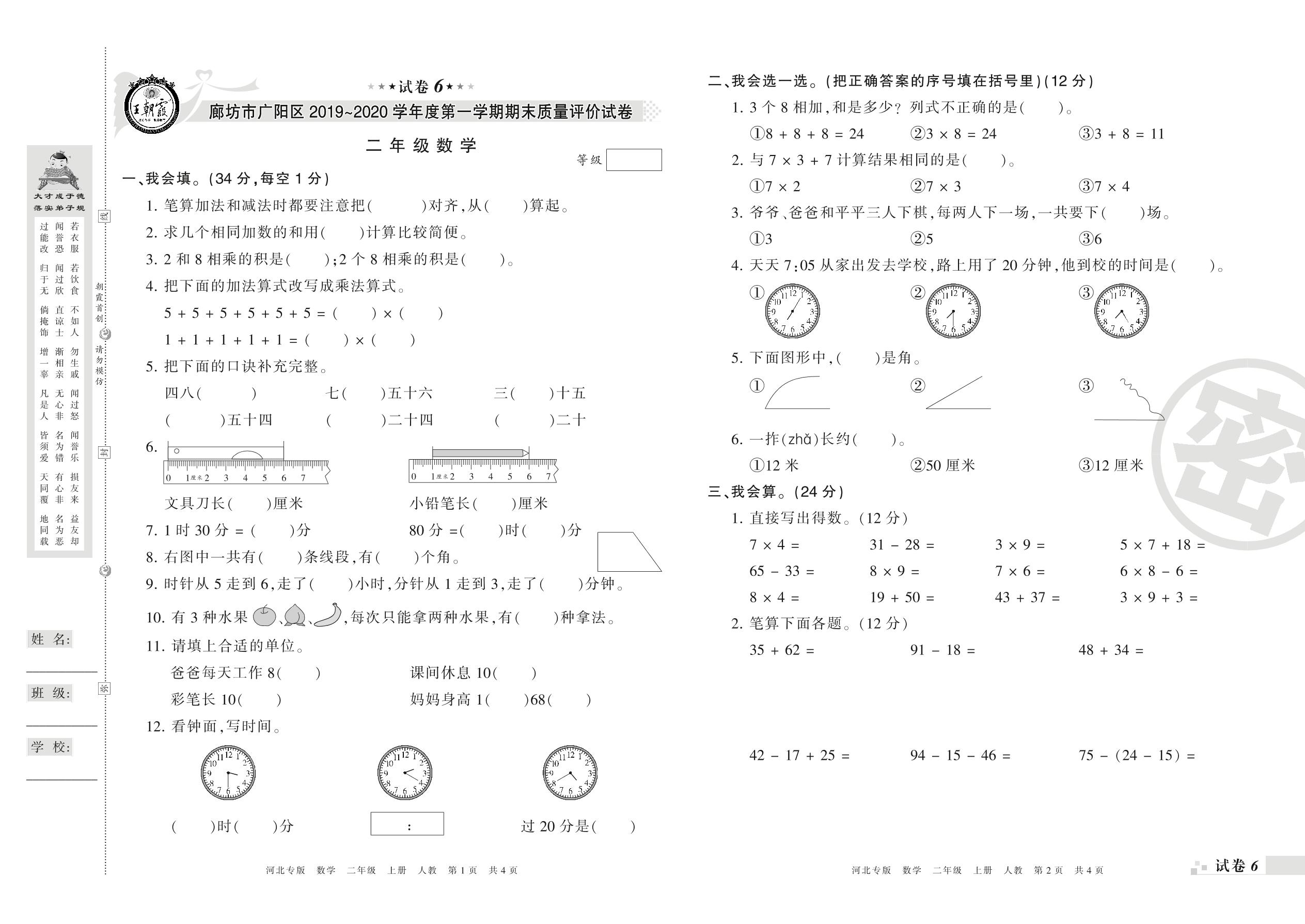 2019-2020学年第一学期廊坊市广阳区二年级数学试卷(人教版)【6】